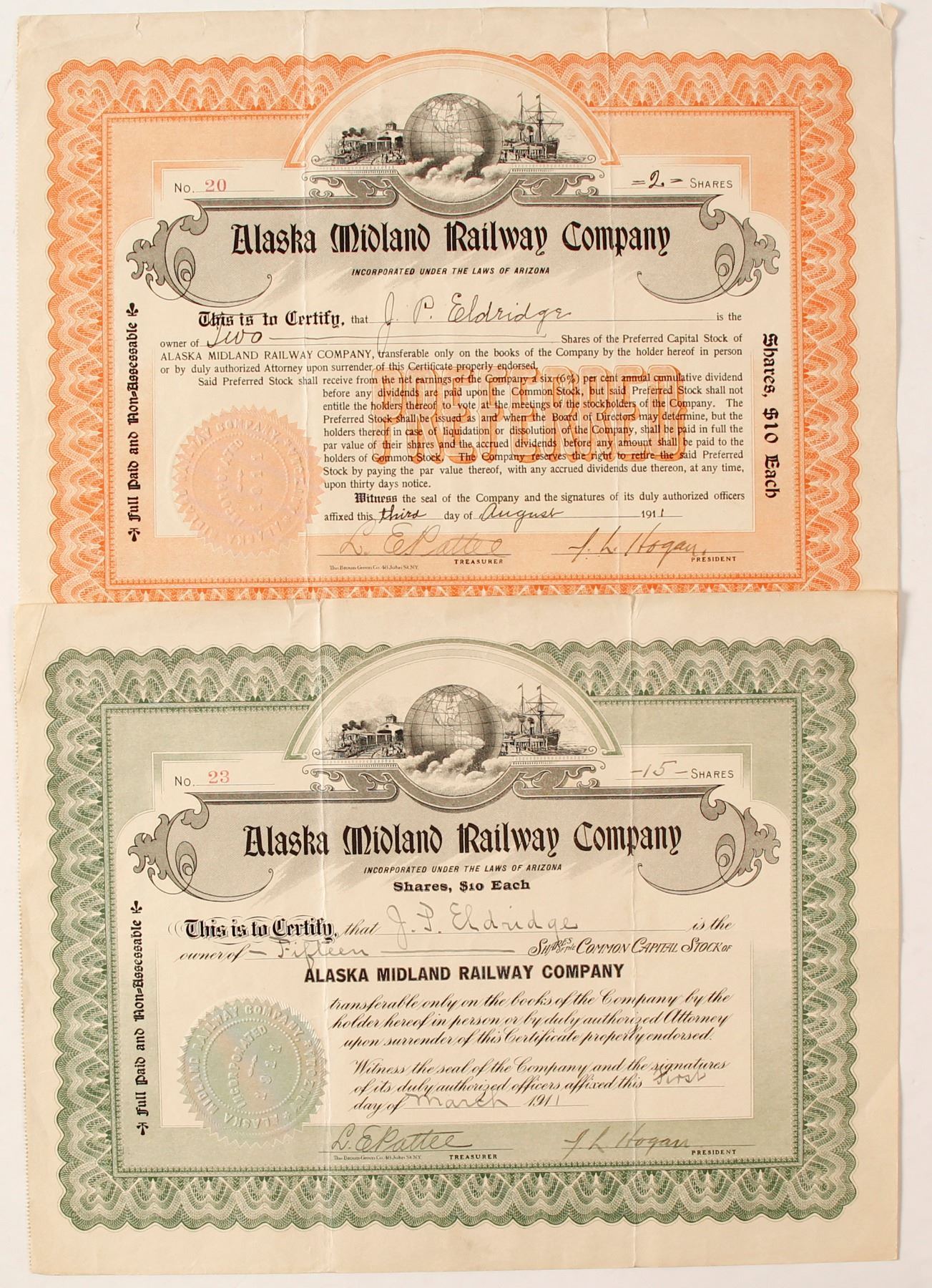 Two stock certificates from the Alaska Midland Railway Company, Printed by: The Broun-Green Co. for J. P. Eldridge, signed by J. L. Hogan, president. 1) Twenty shares of preferred capital stock, number 20 dated August 3, 1911. 2) Fifteen shares of common capital stock, number 23. Ken Prag Collection. State: City: Date: HWAC# 83642