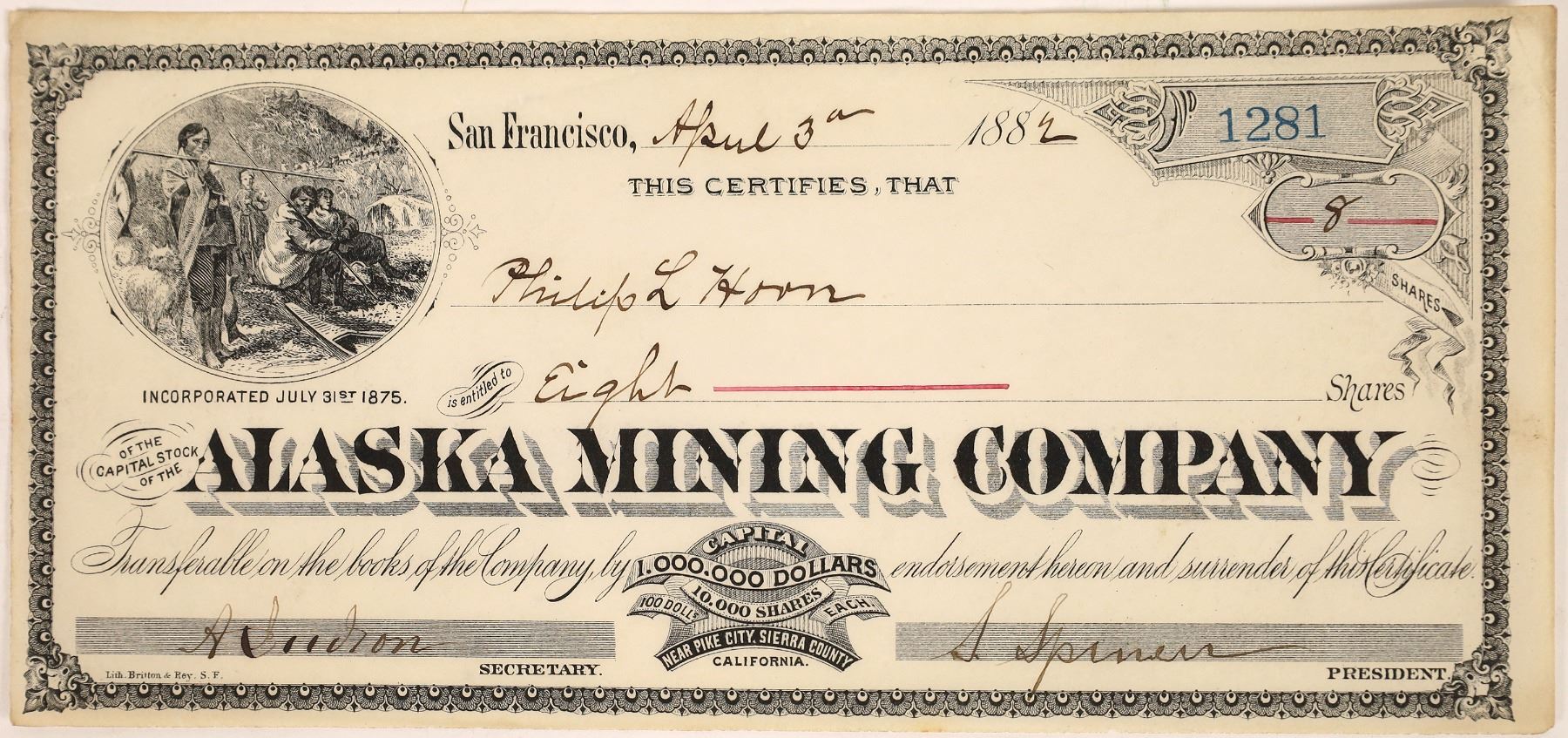 "Near Pike City, Sierra County, California" (printed at bottom center). Inc. July 31st, 1875. No. 1281, issued for 8 shares to Philip L. Horn in 1882. Signed by president S. Spencer and the secretary. Not cancelled. Black border and print, with an interesting vignette of Native Alaskans. Britton & Rey. Pinholes, wear to corners. 4 x 8.75" The Sierra Alaska property embraces the following claims: The Bates 11 acres, Spencer (like in the president's name) 11 acres, Phillips, 9 acres, Grizzly 17.18 acres. All patented. Also the Hog Eye 20.65 acres, New Alaska Extension 20 acres, Parasite 20 acres, and Lonesome Cub 20 acres which are unpatented. Includes two patented homesteads making a total of 480 acres. The Alaska lode is covered for a length of 4600 and the Grizzly for 2600. There is some timber on the property. [California Journal of Mines and Geology, Volume 16, Part 1].