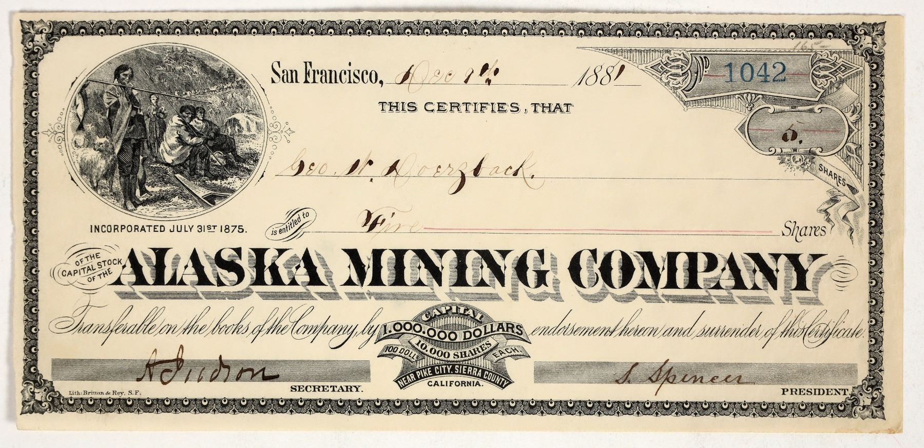 I/U. Issued 1881, "Near Park City, Sierra County, Calif." Britton & Rey printers. No tears, holes or stains. This mine, often referred to as the Sierra Alaska property, embraces the following claims: The Bates 11 acres, Spencer (like in the president's name) 11 acres, Phillips, 9 acres, Grizzly 17.18 acres. All patented. Also the Hog Eye 20.65 acres, New Alaska Extension 20 acres, Parasite 20 acres, and Lonesome Cub 20 acres which are unpatented. Includes two patented homesteads making a total of 480 acres. The Alaska lode is covered for a length of 4600 and the Grizzly for 2600. There is some timber on the property. [California Journal of Mines and Geology, Volume 16, Part 1].