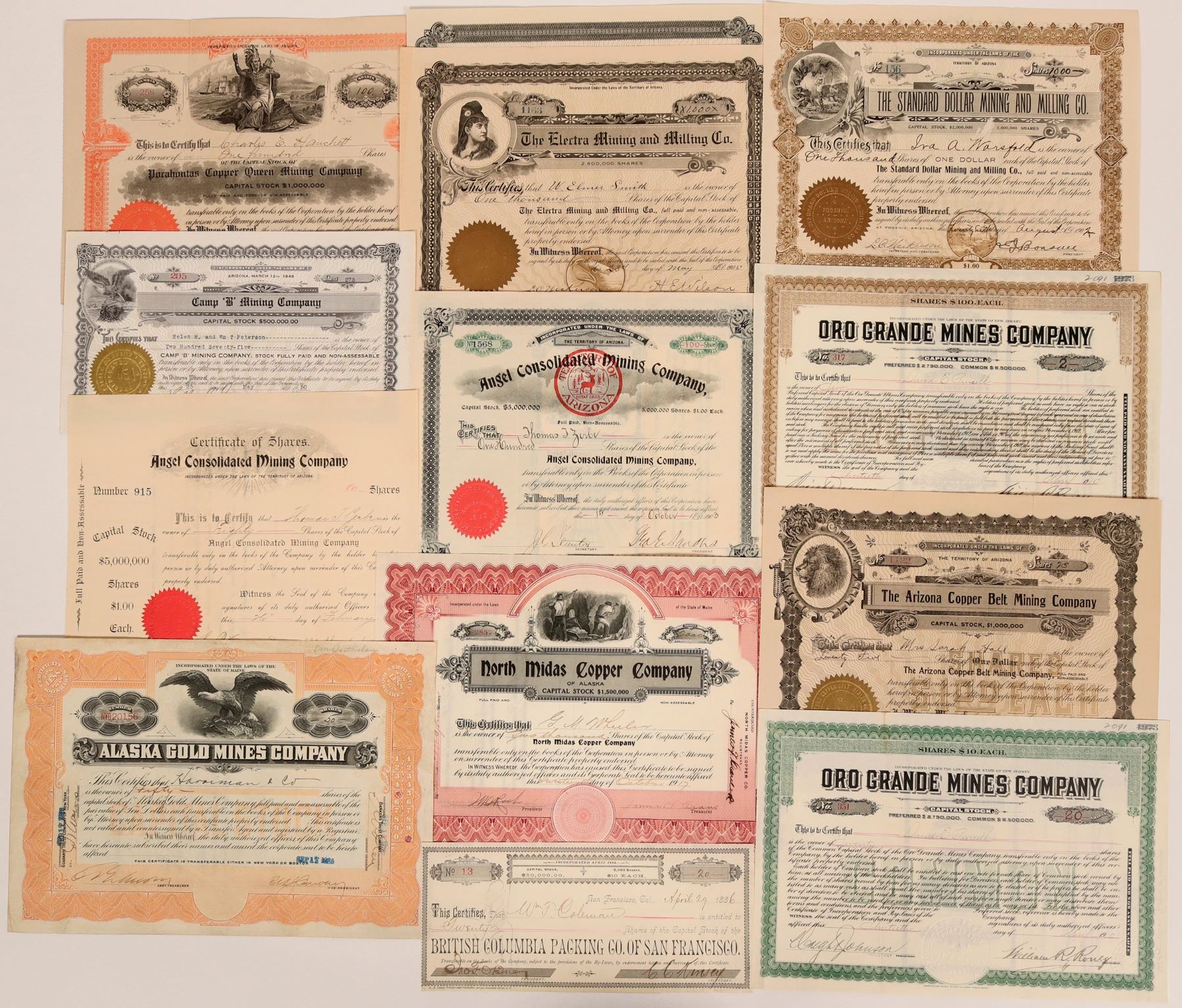 1. Early and lucky number 13 for 20 shares to William T Coleman. Signed by Jonathan O'Brien and CC Kinsey president., Dateline San Francisco 1886. Incorporated April of 1884. Not cancelled. AJ Leary printer. 2. Alaska Gold Mines Company. Inc. in Maine. Issued in 1926, not canceled. Orange border, black print and eagle vignette.Heavy folds, pinholes, soiling. 3. North Midas Copper Company of Alaska. Mine at Berg Creek. Inc. in Maine. Issued in 1917, not cancelled. Red border, black print, and mining vignette. Multiple folds. 4. Group of 10 - Electra Mining & Milling Co. (1902 and 1905); Pocahontas Copper Queen MC (1908, Weaver District); Arizona Copper Belt MC (1927, Black Rock District); Angel Cons. MC (two different, 1903); Oro Grande Mines Co. (two different, 1910); Camp "B" MC (1950); and The Standard Dollar Mining & Milling Co. (1902). Please inspect.