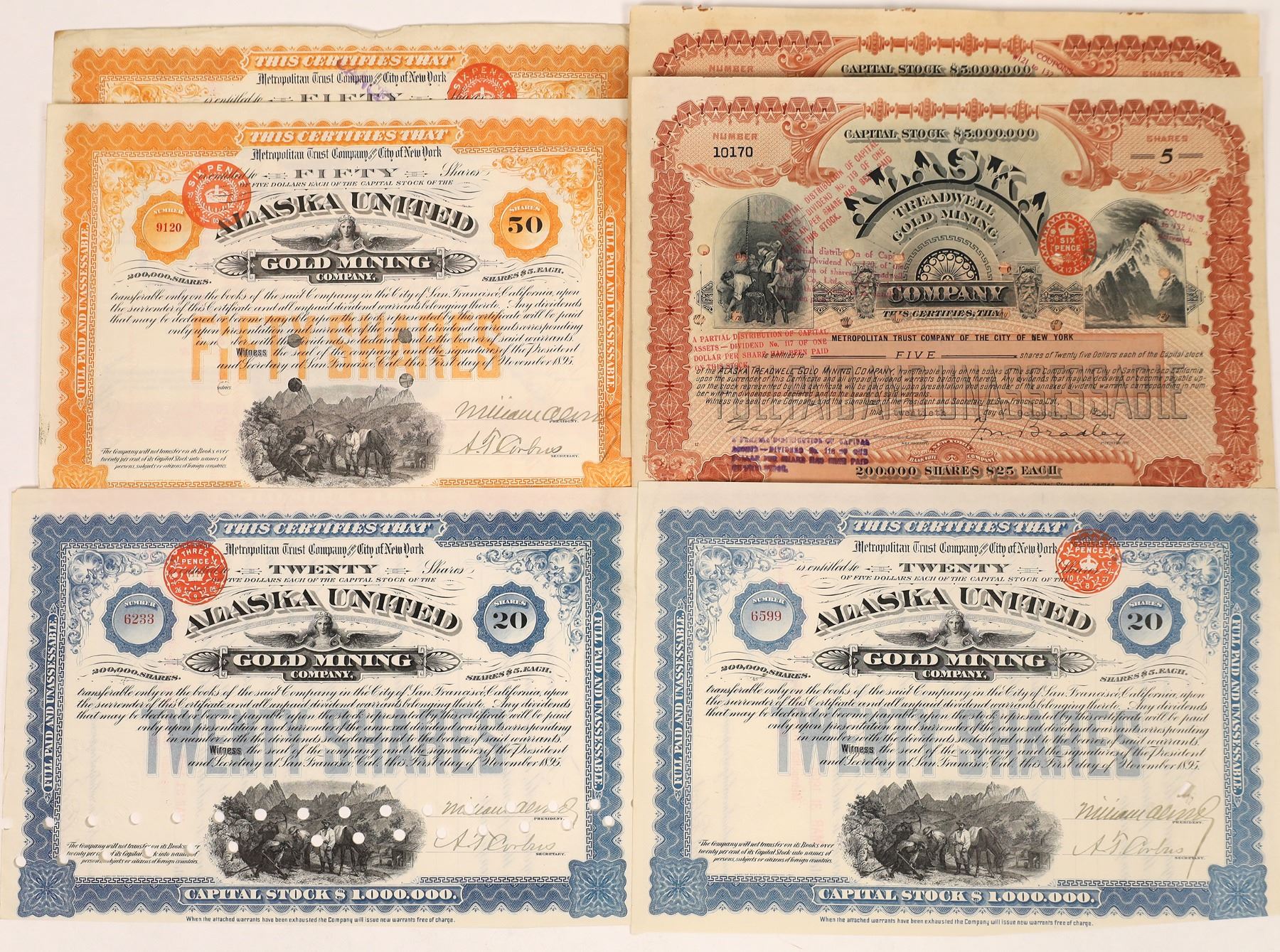 Lot of 6, two different companies, issued and punch cancelled 1895-1924. 1) Alaska United Gold Mining Company: four stocks, two varieties, issued in 1895, signed by William Alvord. 2) Alaska Treadwell Gold Mining Company: two stocks, 1924. All have foreign revenue stamps. Varying condition, please inspect. Operated at Treadwell.