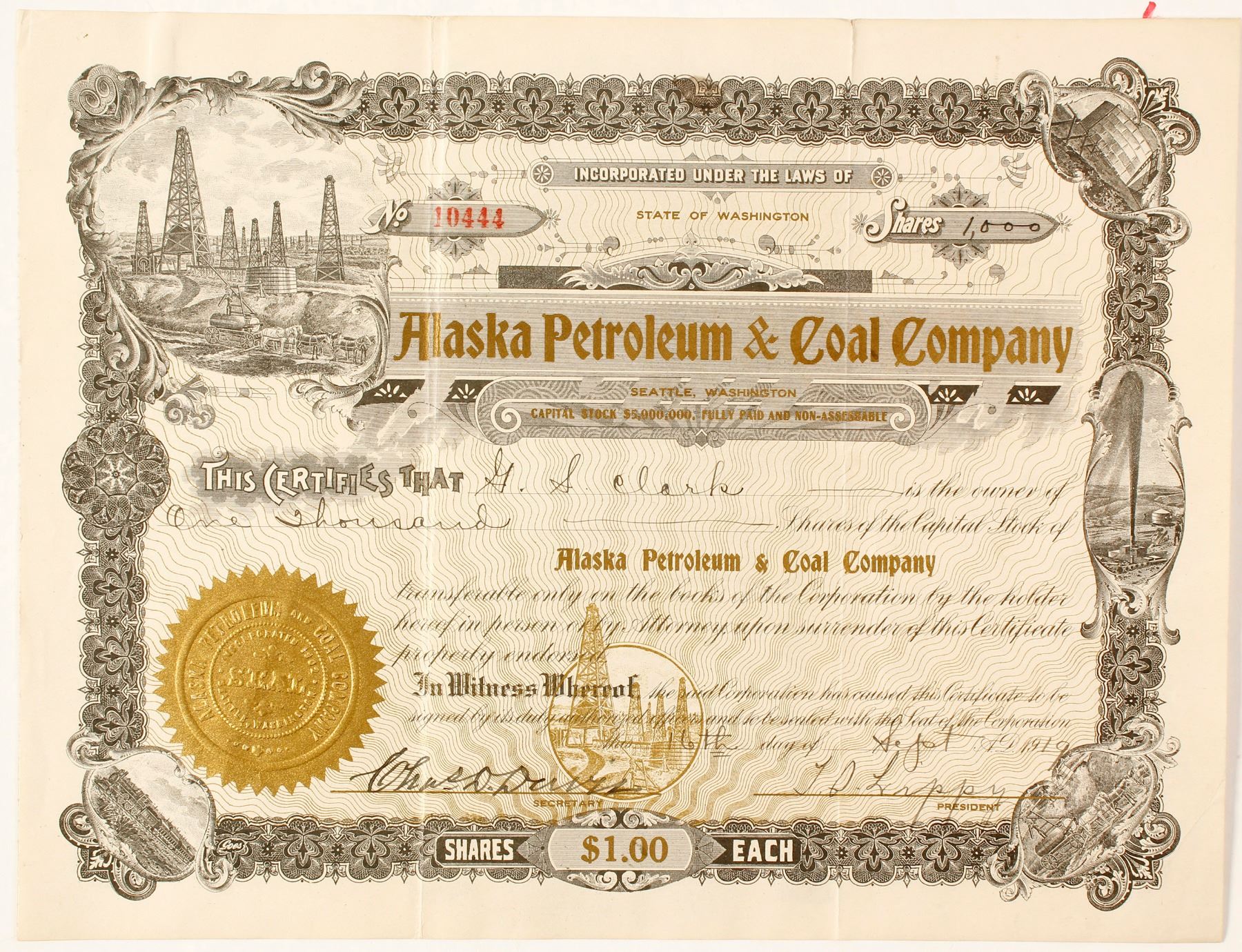 One thousand shares of Alaska Petroleum & Coal Company, number 10444, dated September 16, 1919 issued to G. S. Clark. Assigned September 16, 1919. Drill rig, gushing oil well, train and horse-pulled wagon vignettes. Incorporated under the laws of the state of Washington. Alaska Petroleum & Coal Company was an early Alaskan oil company. Grey border, gold seal. Ken Prag Collection.