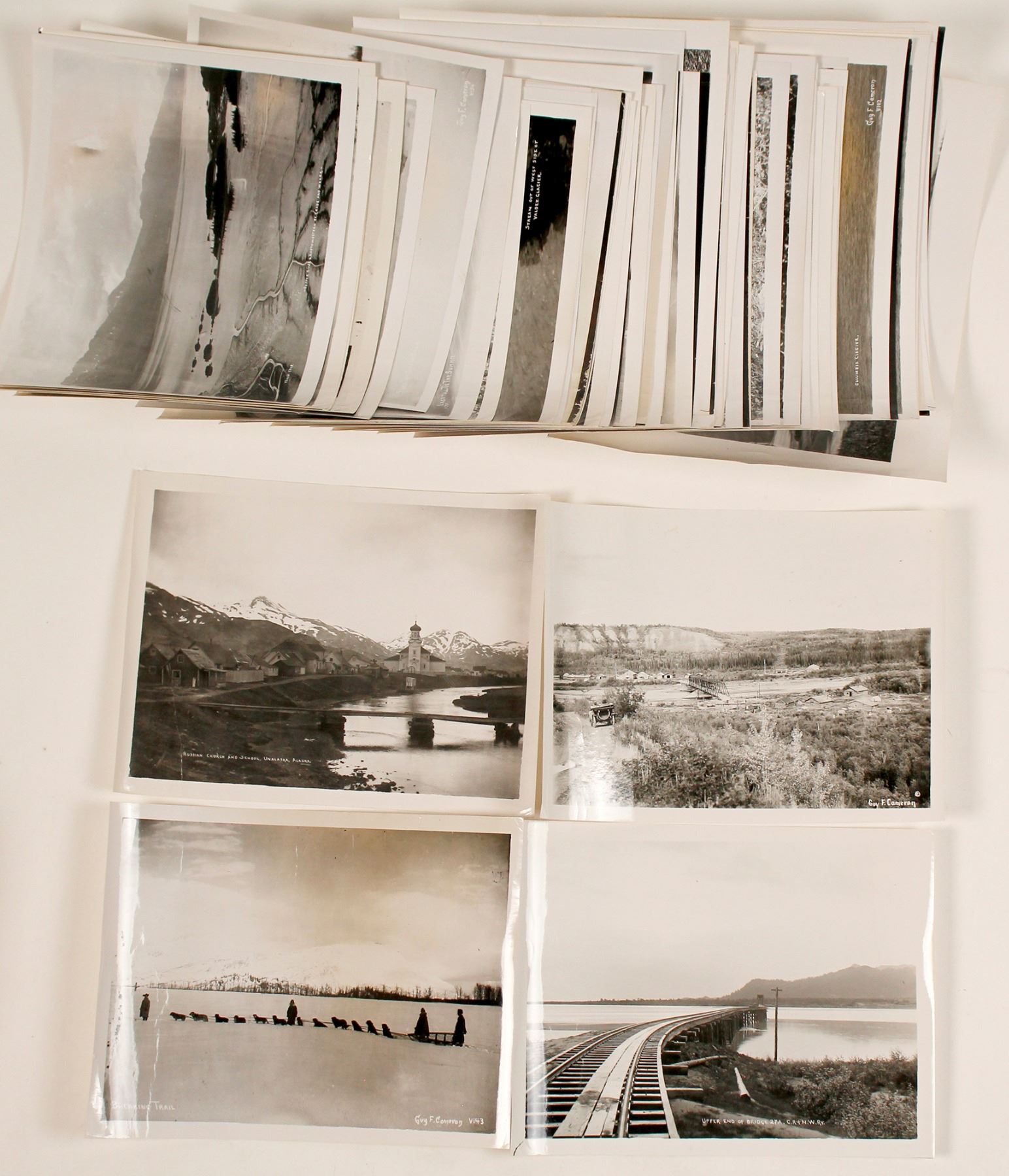 Approx 70 b/w photos, mostly 6.5" x 8.5" of Alaskan scenes c. 1900-1910 reprinted in 950's. Many outdoor snowy scenes including dogsleds, Valdez, mining, Bridal veil Falls, Shoups's Glacier, lakes, fish, bear and more. Nice group.