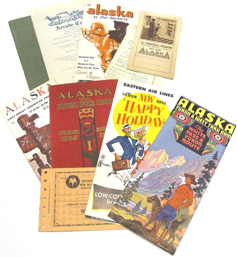 12 items. Cassiar cafe menu, Arrade Cafe menu 1931, Yukon Arcade Cafe menu-Iceworm tea anybody?, booklet New Alaska Cork Insulated Refrigerator, The White Pass & Yukon Route Tourist Booklet, 1969 Air Alaska Tour receipt, Pacific Northern Airlines tourist booklet, 1947 grant deed, 2 Pan American vacation booklets, 1954 Eastern Airlines brochure, Pacific Coast Steamship Co., 1905 brochure 14pp. Pacific Northwest and Alaska Union Pacific 1930 48pp booklet with maps. Date: Location: Alaska HWAC # 54936