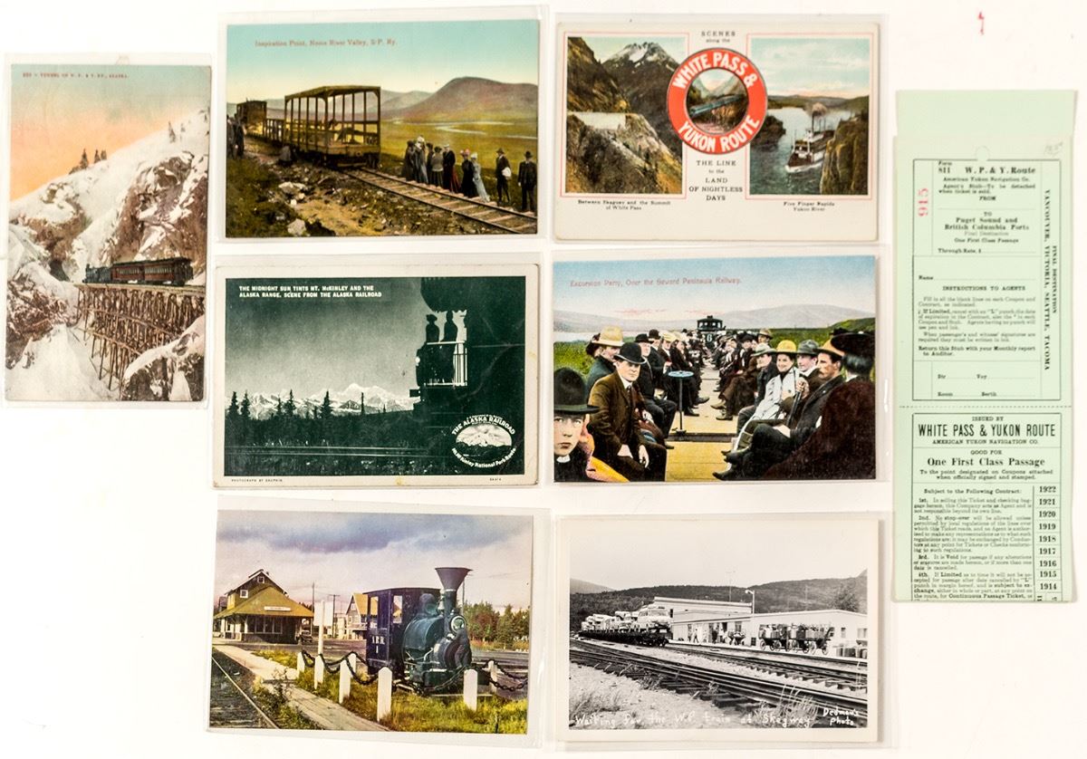 Lot of 8. Seven postcards: early printed, mailed 1908 Skagway and 1942 Plymouth, plus one later real photo of train station at Skagway. Also an unissued ticket c. 1914 for first-class passage on the White Pass & Yukon Route to Dawson, Skagway, Tanana, and White Horse. (Prag Collection) City: State: Alaska Date: Inventory# 34869