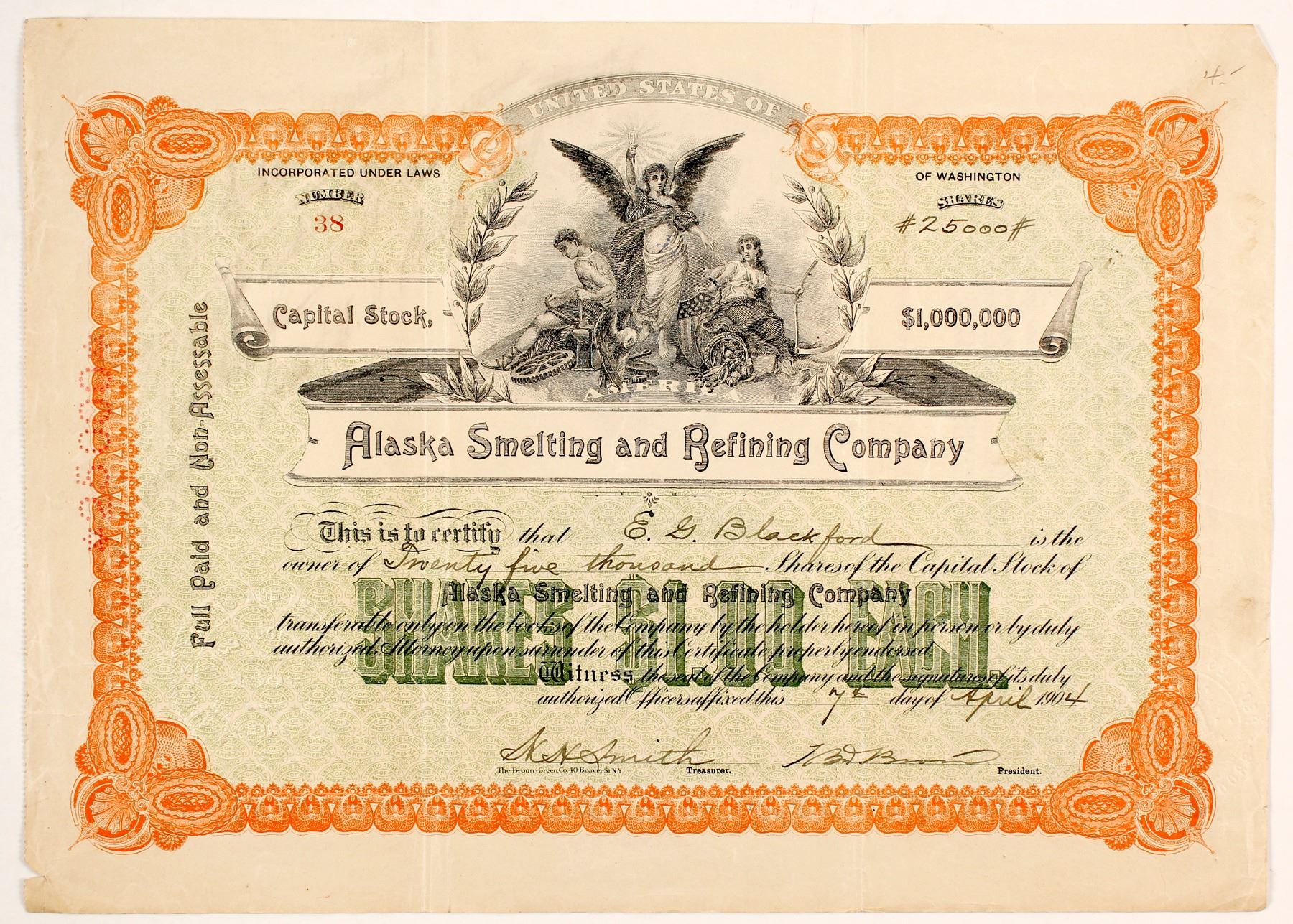 # 38 for 25,000 shares to EG Blackford. Signed by NH Smith and president (?). Dateline 1904. Incorporated 1903. Allegorical vignette. Orange border, green safety paper, underprint 'Shares $1.00 Each.' One of the more attractive Alaska stocks. Hadley Island is on the Tanana River near Ketchikan. Although a black on white specimen is listed in Hanscom, no stock certificate is listed. Prag Collection State: Alaska City: Hadley Date: 1904
