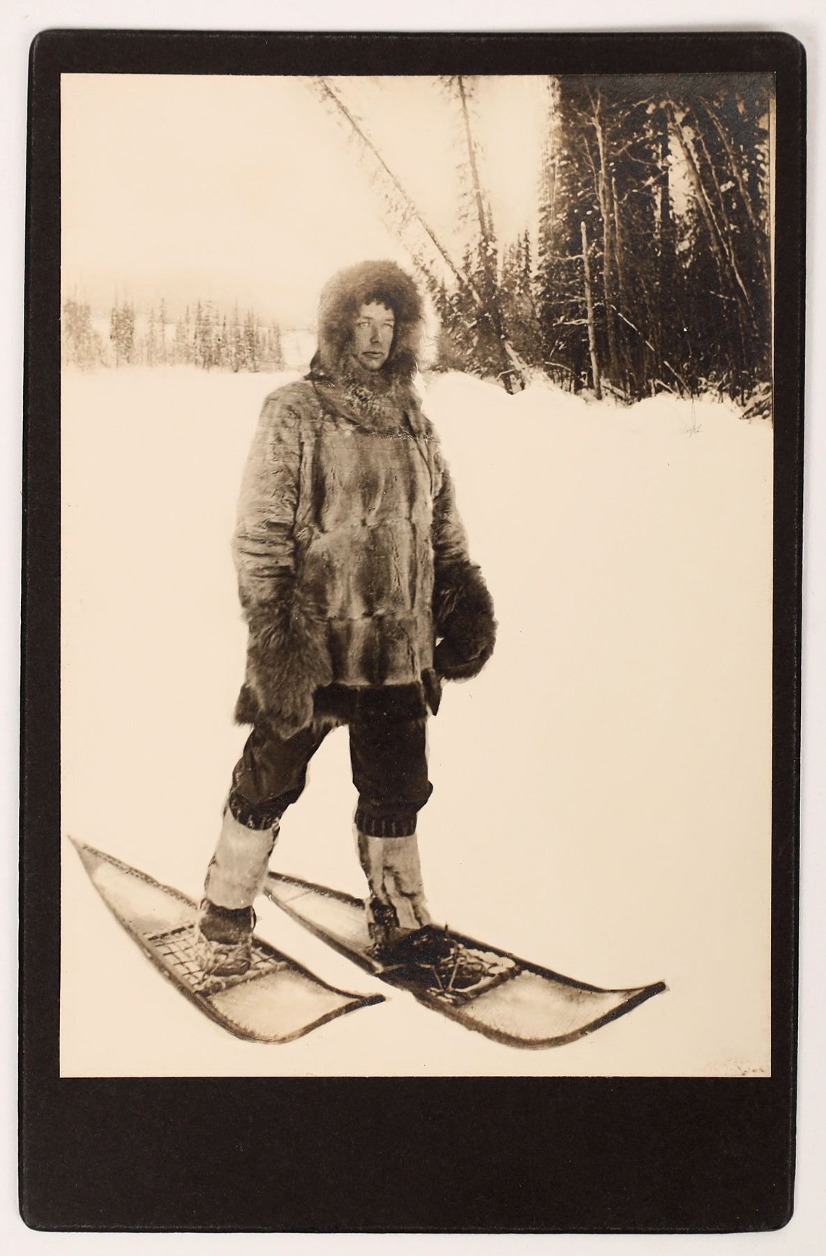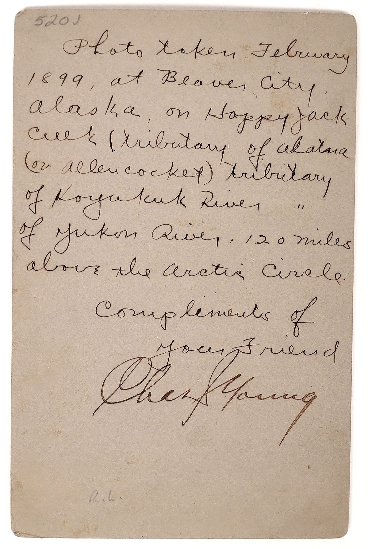 1899 photo of Chas. Young in shoe shoes at Beaver City, AK, on Happy Jack Creek as per verso inscription. We could not find any info on Mr. Young. 5.25x3.75". Alaska