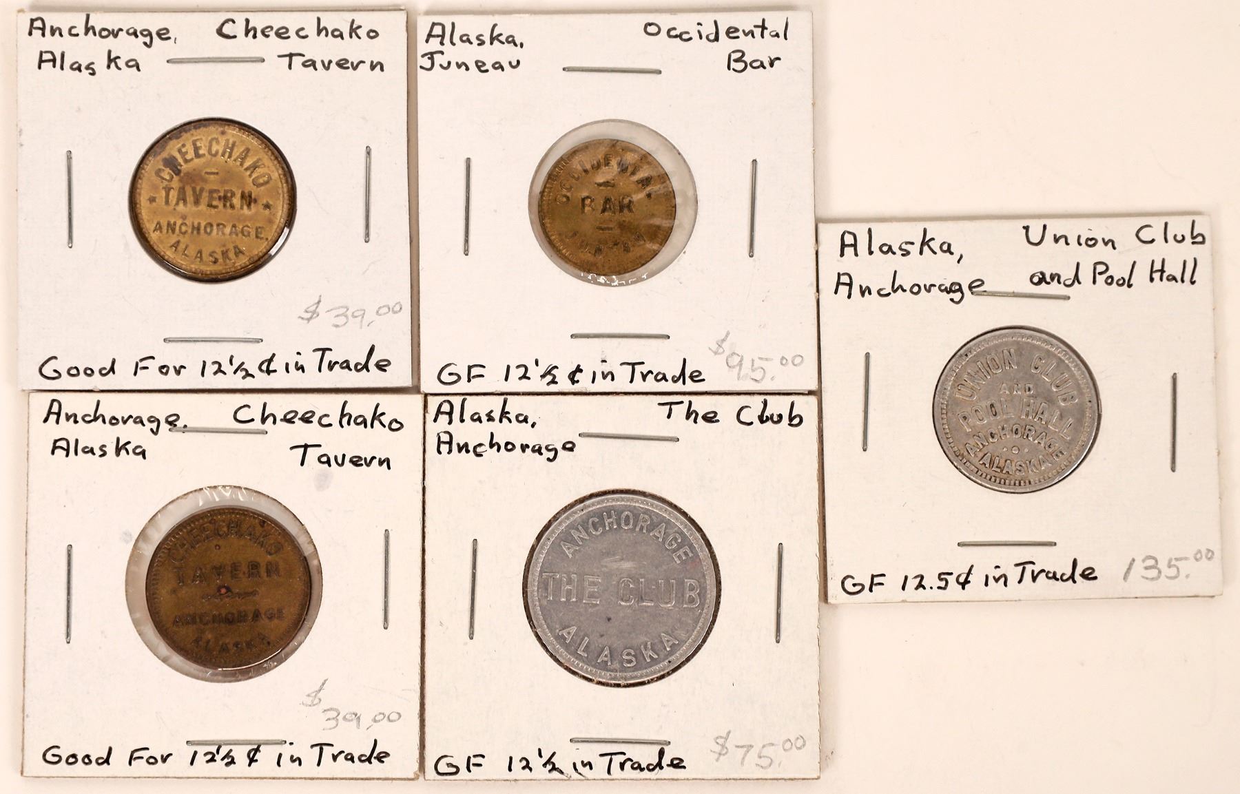 Lot of five Alaska tokens: Anchorage: Cheechako Tavern GF 12 1/2c (2); The Club GF 12 1/2c; Union Club and Pool Hall GF 12 1/2c; Juneau: Occidental Bar GF 12 1/2c in trade. Alaska