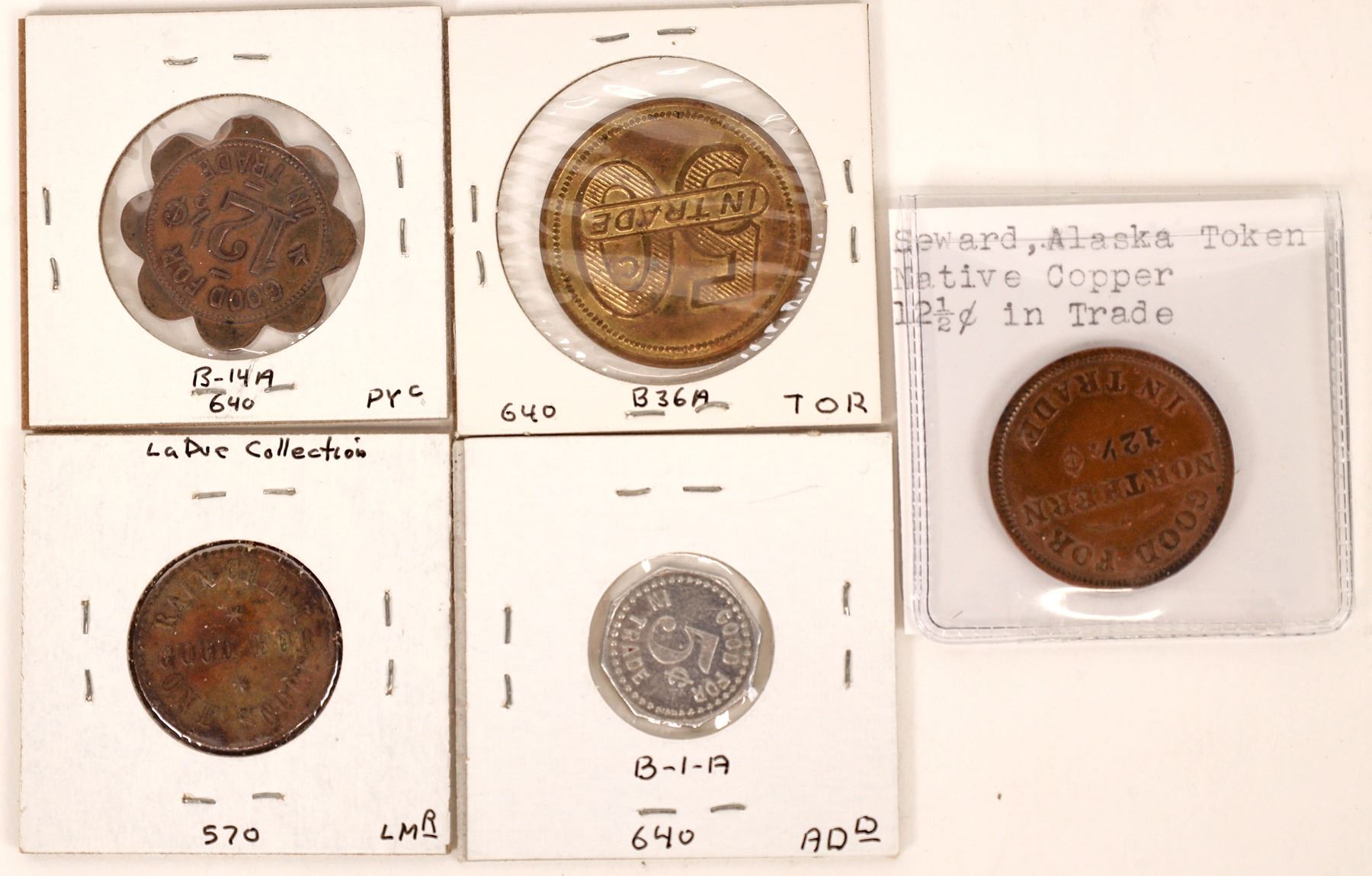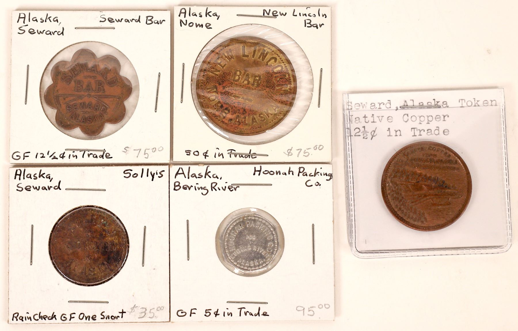 Lot of five tokens from Alaska: Seward: Native Copper; Solly's; Seward Bar. Bering River: Hoonah Packing Co.. Nome: New Lincoln Bar. Alaska