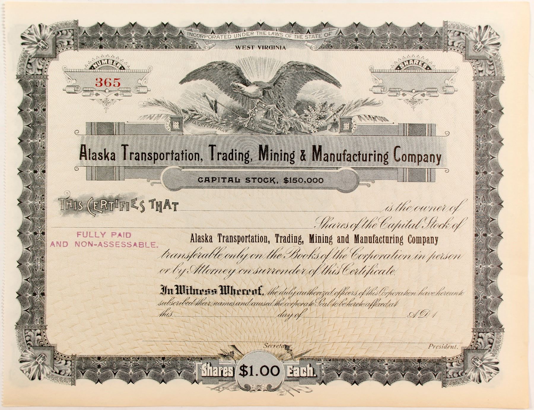 Unissued shares of Alaska Transportation, Trading, Mining & Manufacturing Company, number 365. Ken Prag Collection.