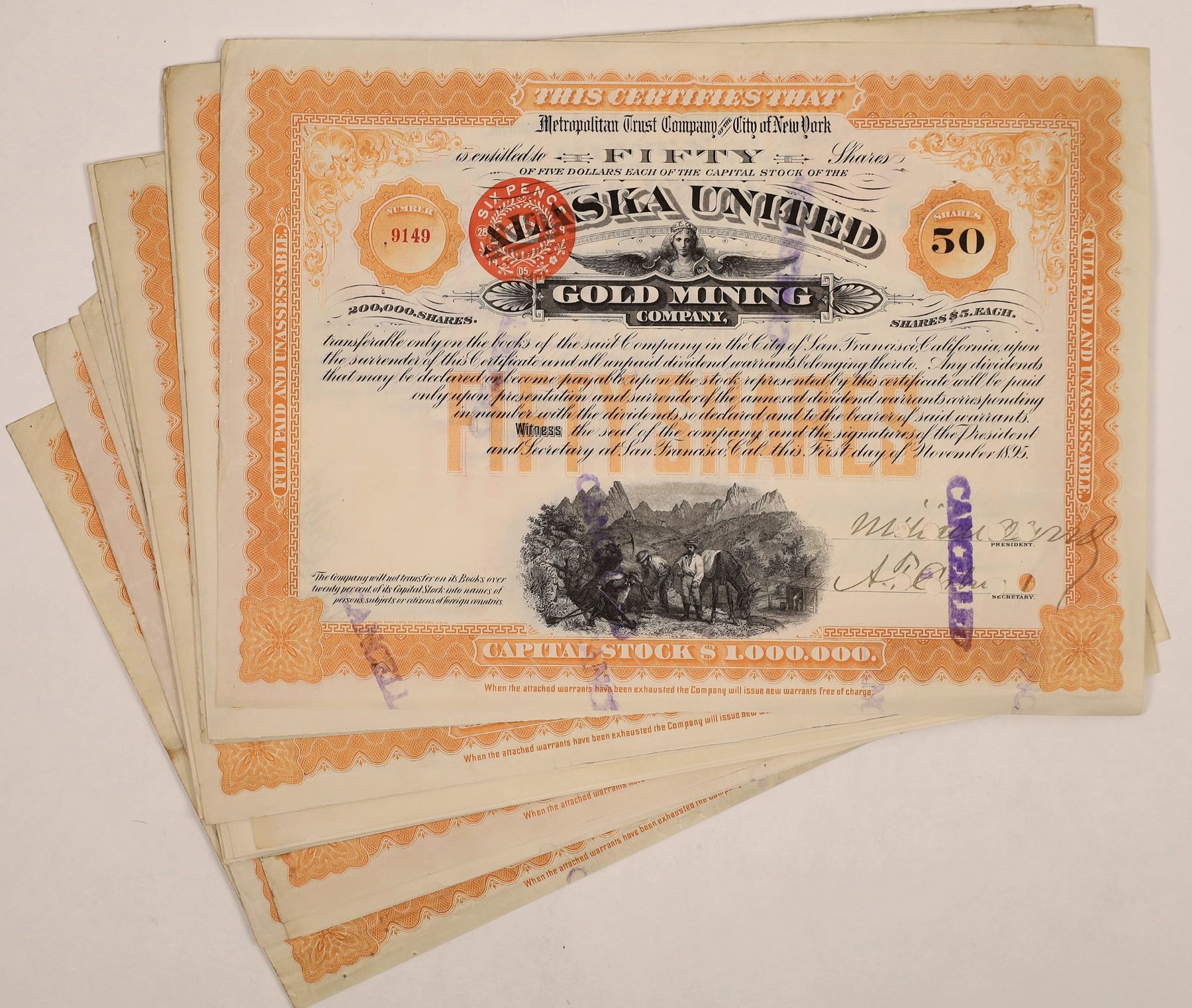 Lot of 19 issued stock certificates, identical design. These are the 50 share certificates issued in 1895. All are punch cancelled; some are also stamp cancelled. All have six pence imprinted revenues. Orange border, black print, and vignette of miners working on the surface. Varying condition, please inspect. This company operated mines in the Treadwell Group at Juneau.