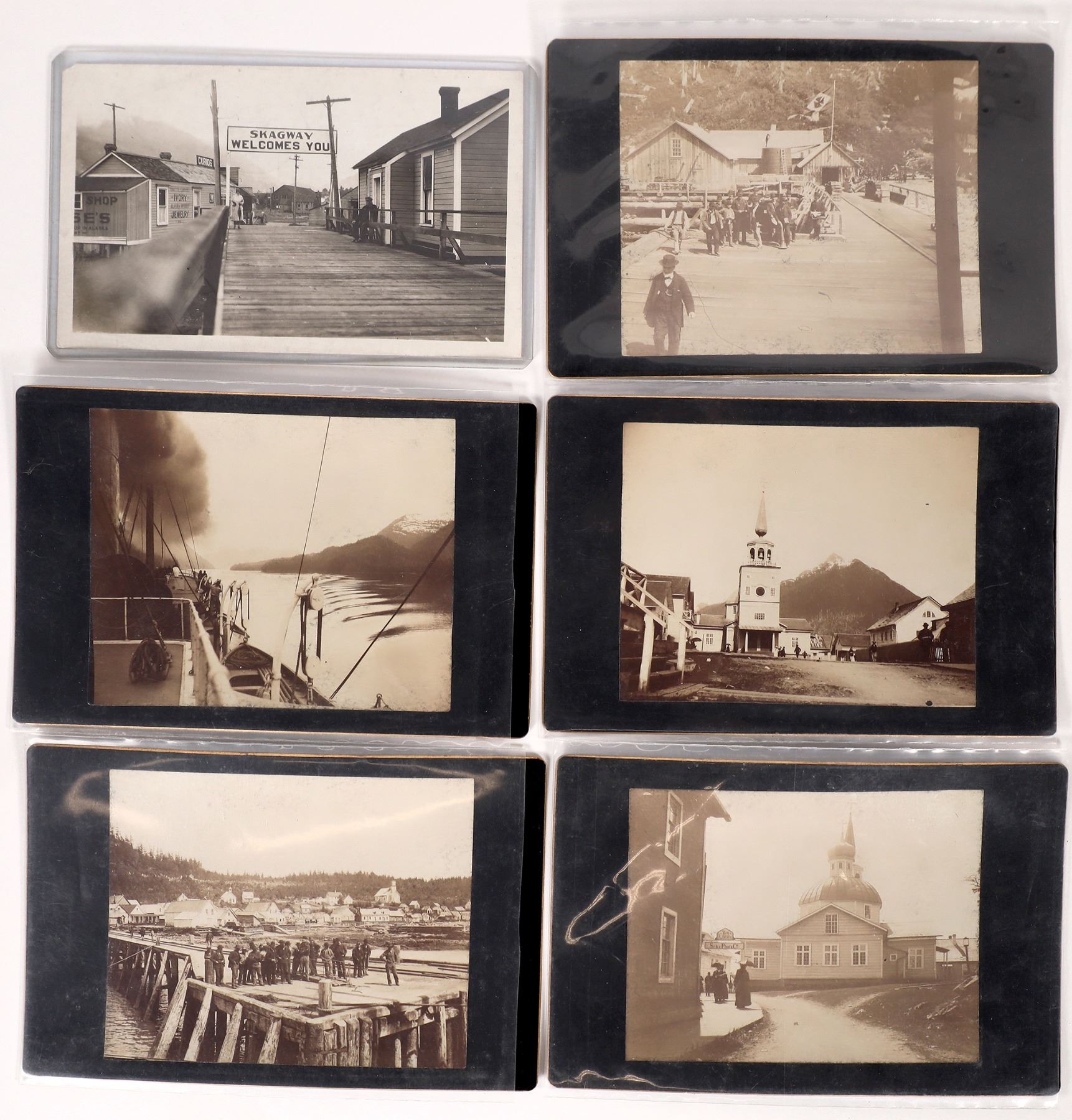 6 mostly c. 1900-05 Alaska photos. 3.5x6.5", Skagway Welcomes You, upper right corner small chip.3.5x4.5"-Wrangel wharf and village, Sitka Greek church, unlabeled church, Juneau band on wharf, The channel en route to Alaska.
