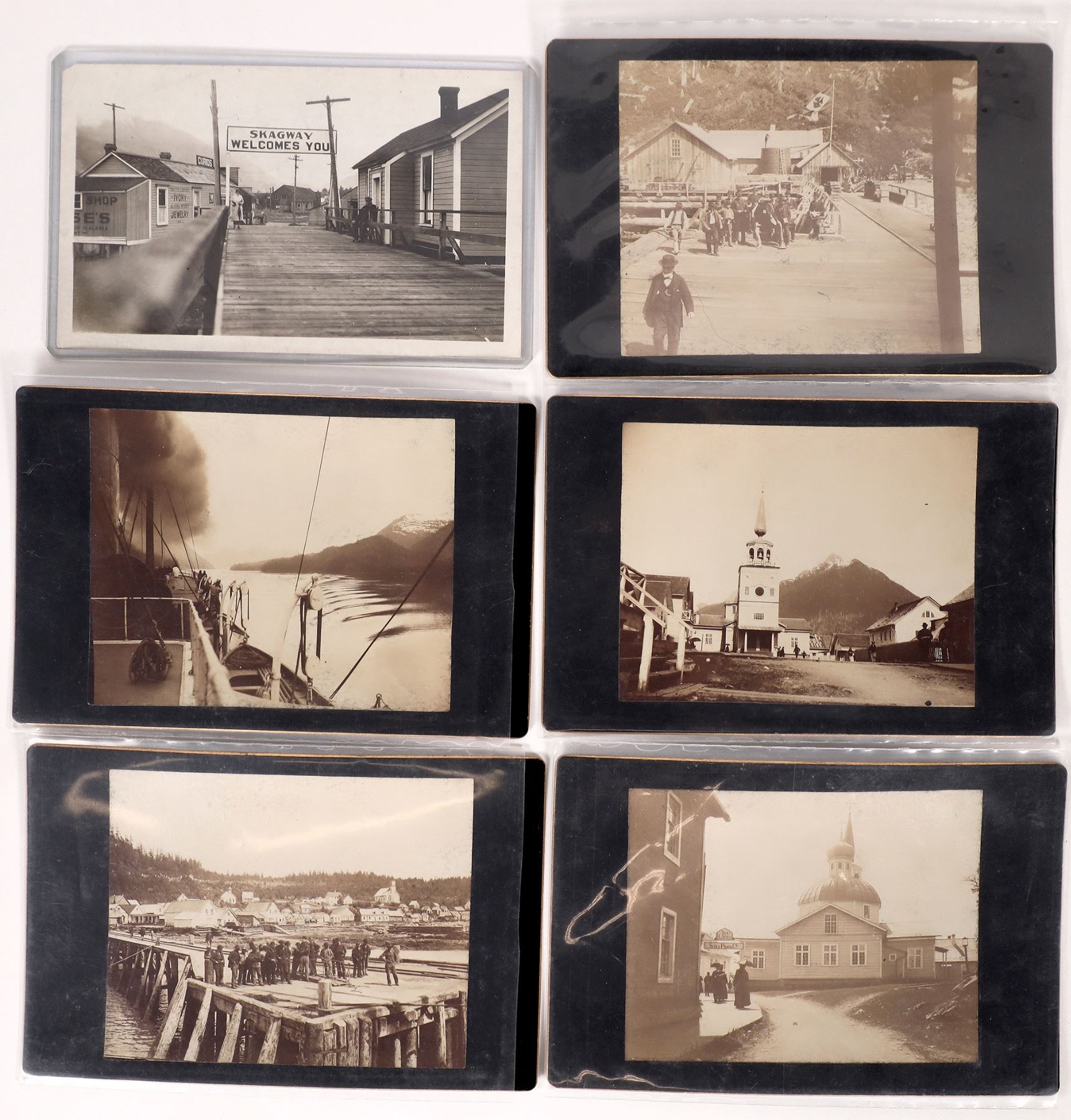 6 mostly c. 1900-05 Alaska photos. 3.5x6.5", Skagway Welcomes You, upper right corner small chip.3.5x4.5"-Wrangel wharf and village, Sitka Greek church, unlabeled church, Juneau band on wharf, The channel en route to Alaska. Alaska