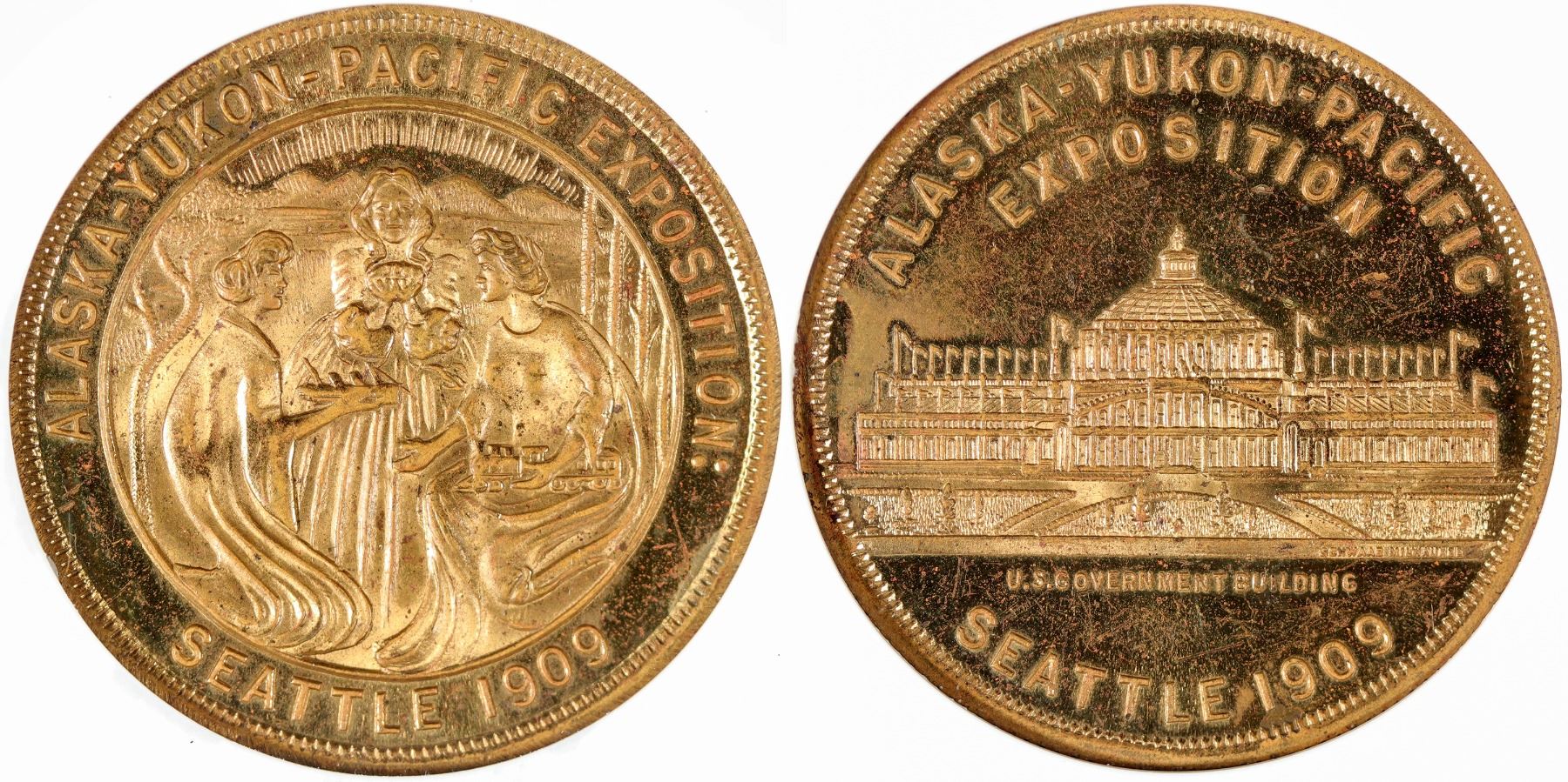 Obv: In center is Seal similar to Exposition Seal but without bust of Seward; above, around Alaska-Yukon-Pacific Exposition; below Seattle 1909; beaded border. Rev: Edifice; above Alaska-Yukon-Pacific / Exposition; below edifice, in small letters, U. S. Government Building; below Seattle 1909; on bottom r. of building, Schwaab Milwaukee; beaded border. HK-367 Brass, reeded edge. 36mm. NGC certified MS 62 PL. R5.