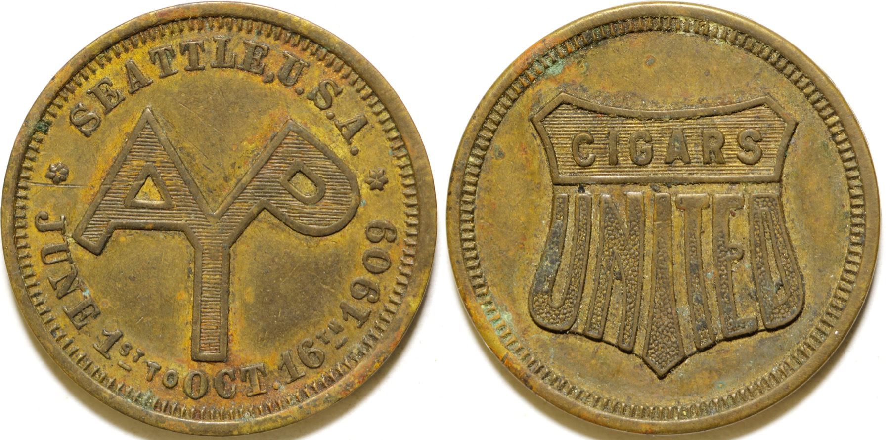 United Cigars. AYPE. Seattle, U.S.A. / June 1st - Oct. 16th, 1909. Br. rd., 31 mm. Daniel Manassillian Collection. State: Alaska City: Seattle Date: HWAC# 83925