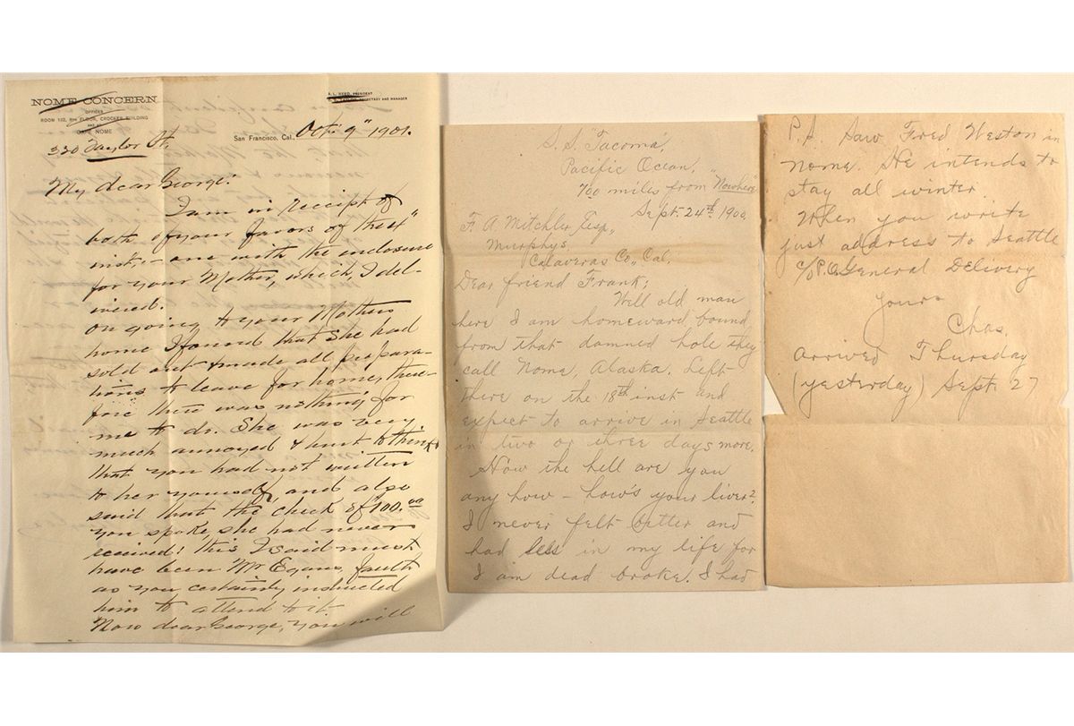 1) Wonderful 1900 partial letter from Charles to Frank Mitchler. Charles did not fare very well in Alaska. "Well old man here I am homeward bound from that damned hole they call Nome, Alaska….How the Hell are you any how - how's your liver? I never felt better and had less in my life for I am dead broke." Dated September 24, 1900 from the S. S. Tacoma, Pacific Ocean, 700 miles from "Nowhere". 2) Two Nome Concern offices in San Francisco. 1901 letterhead.City: S. S. TacomaCounty: 700 miles from "Nowhere"State: AKDate: