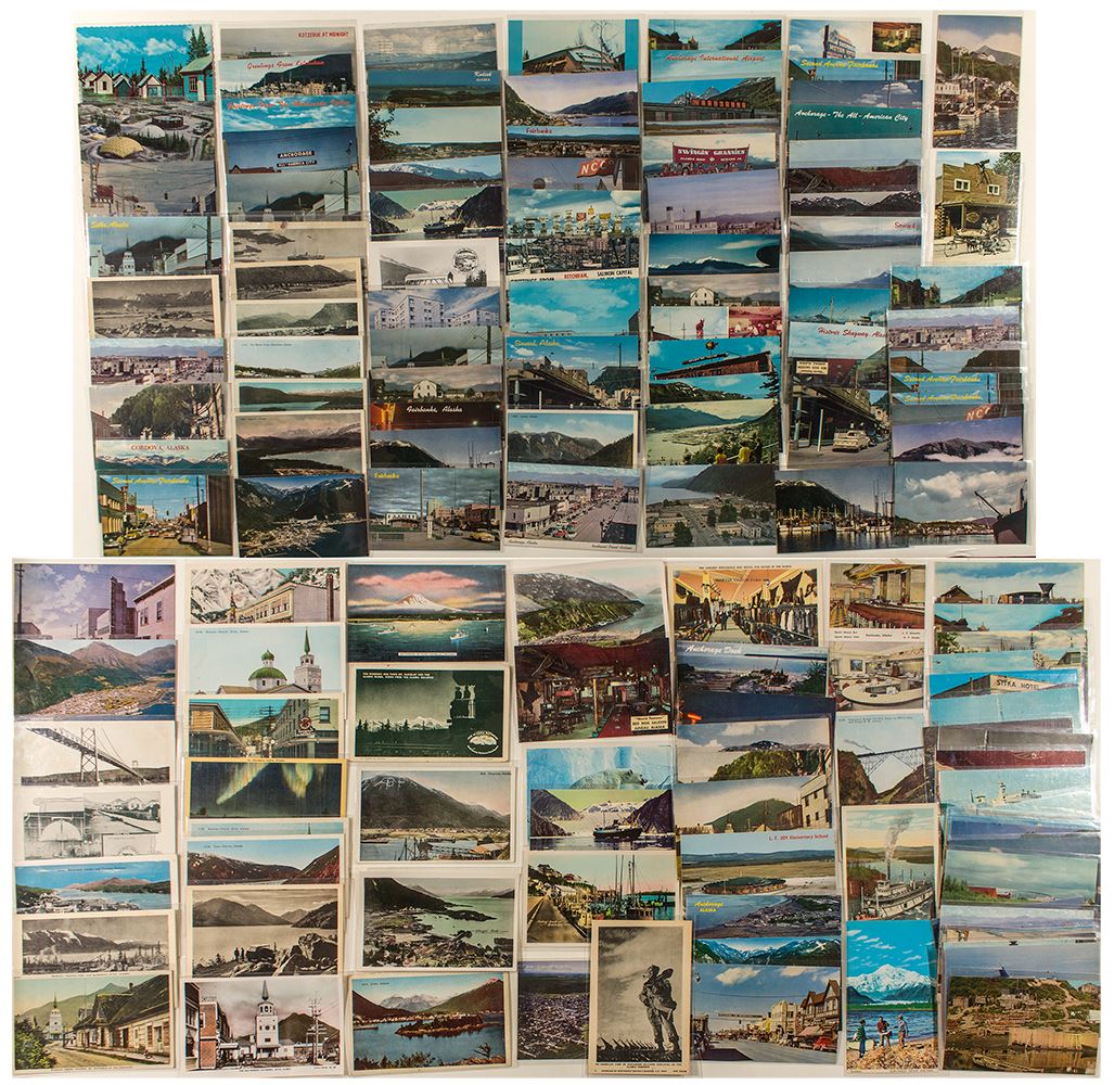 Lot of 149. Airports, ships, bays, floods, fishing, Golden Gate Hotel, Nordale Hotel, Cushman Street Fairbanks, Red Dog Saloon, Sitka Hotel, schools, churches, Donjek River, Alaska Highway, Northern Lights, etc. Places include Haines, Juneau, Sitka, Fairbanks, Whitehorse, Kodiak, Cordova, Seawerd, Ketchikan, Metlakahtla, Hubbell,Wrangell, Anchorage, Matanuska, Kotzebue, etc. (Prag collection)