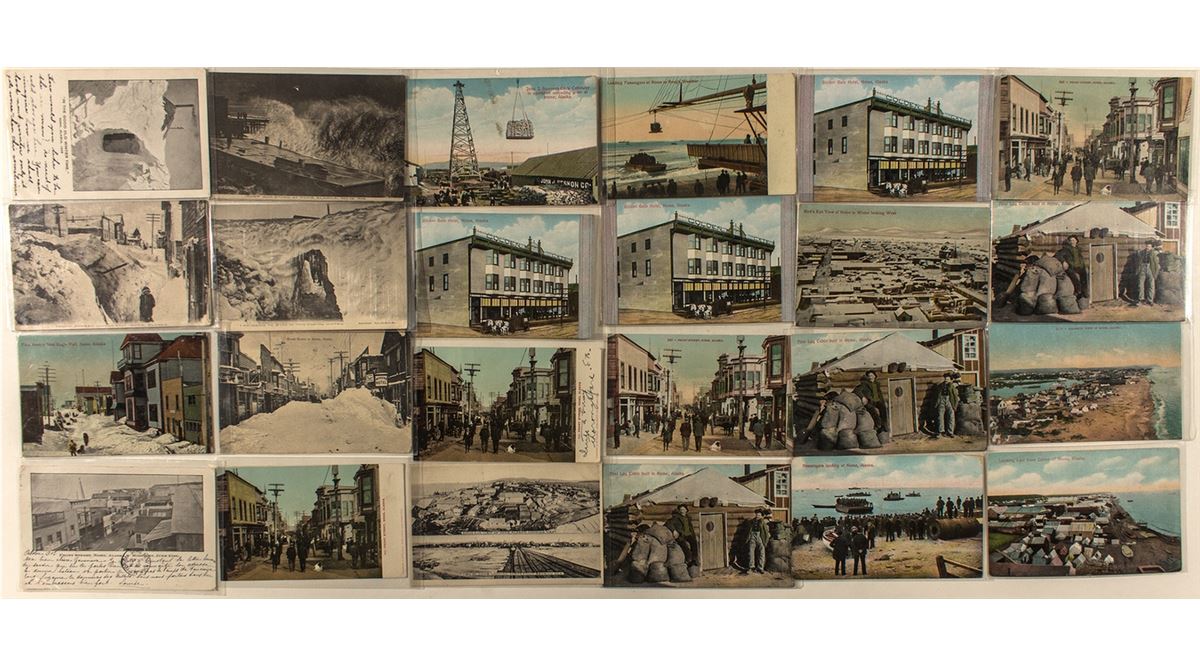 Lot of 24. Includes a nice scene of Front Street at midnight, June 21, 1905 (Land of the midnight Sun ya' know). A November 1, 1906 storm with waves pounding the docks. O. D. Goetze photograph. Four mandatory, huge banks of snow with tunnels. Also Front Street, bird's eye view, first log cabin,tent city, unloading at the wharf, Golden Gate Hotel, passengers arriving in Nome on landing craft (before there was a dock), etc. Two Nome postmarks. (Prag collection)