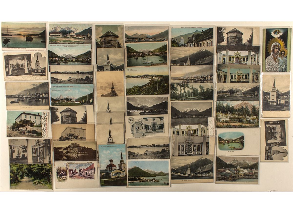 Lot of forty-seven. Eighteen of Russian architecture (St. Michael's and other buildings). Indian town,Indian River Bridge, Thlingit Village, Russian Block House, Mt. Edgecombe, Seven Sisters Peaks, cemetery, Baranoff Castle, street salesman. Postcards published by Puget Sound News Company, PE Kern, CM McGrath of Sitka, Edward de Groff of Sitka, Winter & Pond of Juneau, Lowman & Hanford, Pacific Coast Steamship Co., Alaska Drug & Jewelry of Skagway, etc. Postmarks include two strong Sitka's, one blue Sitka double circle, Juneau, strong White Horse, Skagway, and a 1912 U. S. S. Maryland (on a stop at Sitka?). Prag collection