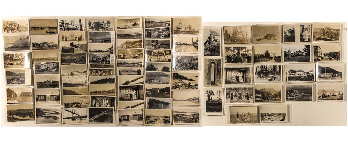 Lot of eighty. ten pre-1915. Includes 1) a photo that says 'City Water Supply.' The wagon is in front of a building that says 'Assay Office.' Whitehorse is hand written on back. 2) Alaska trail Relief Cabin with a dog team out front. 3) Men in a field. Strong Chignick, 1913 postmark. 4) Headquarters of the AARC Colonial Project, Matanaska Valley. Tents lined up in a row. 5) Chignik, 1914 postmark on a card that had sailors on a ship. Card reads, 'Life on the ocean wave, ship 'Star of Alaska,' near Chignik, Alaska. Towns include Petersburg, Tanana, Chignik, Metlakata, Sinuk, Quadra, Kodiak, Burwash Landing, Wrangell, Fort St. John, Hubbell, Matanuska, Chitina, Unalaska, Fort Richardson, Spenard, Palmer, Nenana, Hyder, Craig, etc. (Prag collection)