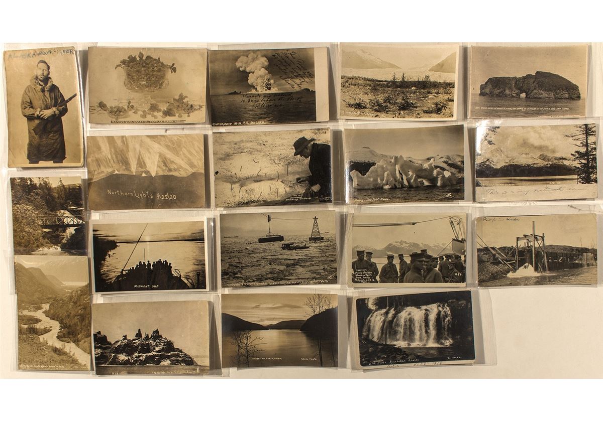 Lot of eighteen. 1) 1910 F. E. Bagger photo of a rock being blown-up by a volcanic eruption. 2) Skagway in background from Rocky Point on the White Pass & Yukon RR. 3) Northern Lights taken by a photographer on March 22, 1920. Not very spectacular in black and white, unless you appreciate the beauty of black and white. 4) 1907 Katalla (1906-1943) postmarked card of native strawberries. 5) Resurrection Point 1916 card postmarked Treadway. 6) Bucoda, Washington postmarked card of 'Pump in Alaska.' 7) W. Green photo of 2nd Falls in Ketchikan. 1918 Ketchikan postmark. Also ice worms, Castle Cabs near Ghignik, midnight sun, HG Kaiser photograph of landing freight in rough seas, 'Alaska Moon Shiver,' Pitchfork Falls, etc. Please see photo for some of these magnificent cards. (Prag collection)