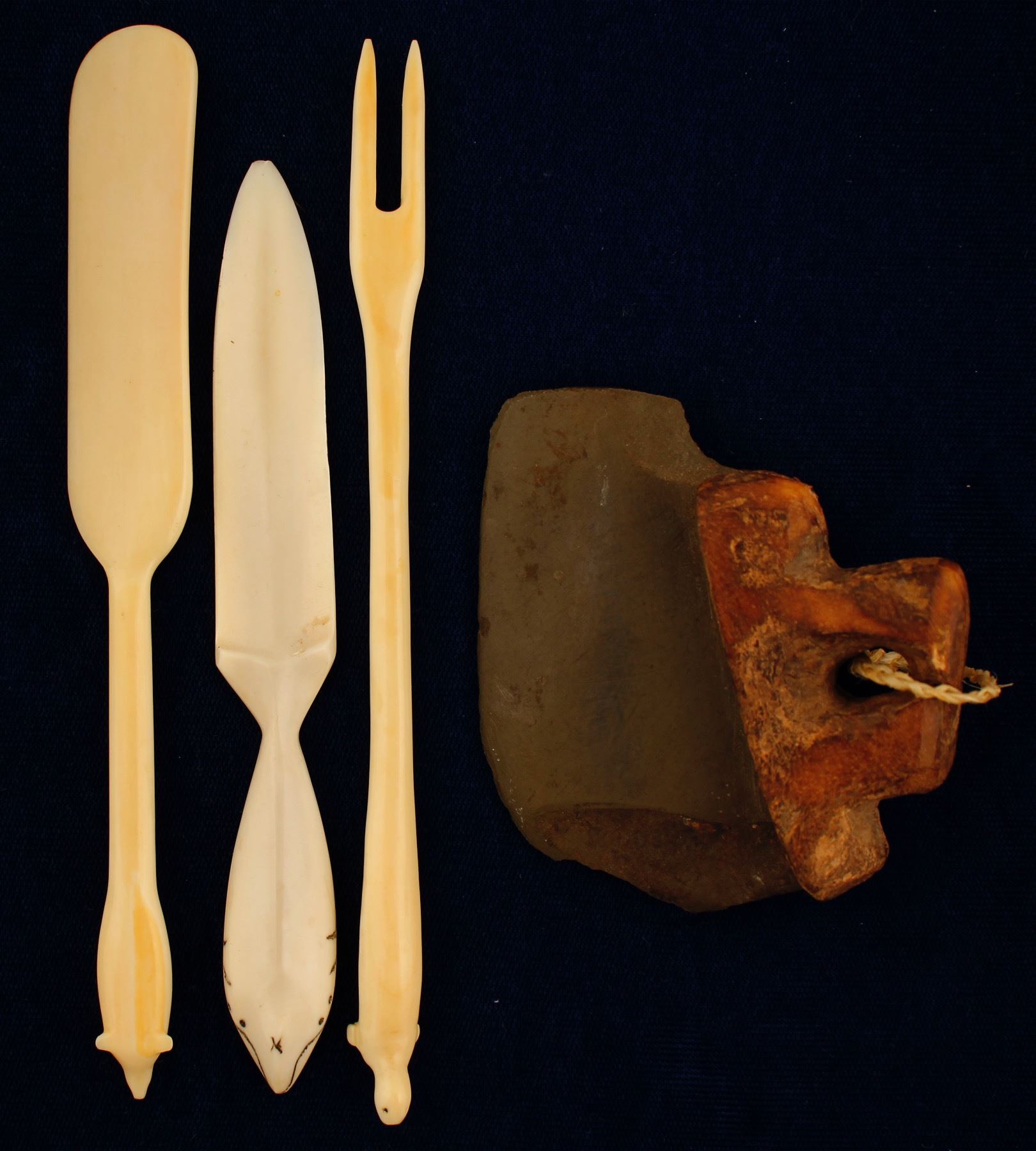 Three ivory items: Cocktail knife and fork with seal figures on the end of the handles, and a letter opener with a figure of a whale on the handle. Also included in this lot is a hand made scraper. Date: City: State: Alaska HWAC# 76631
