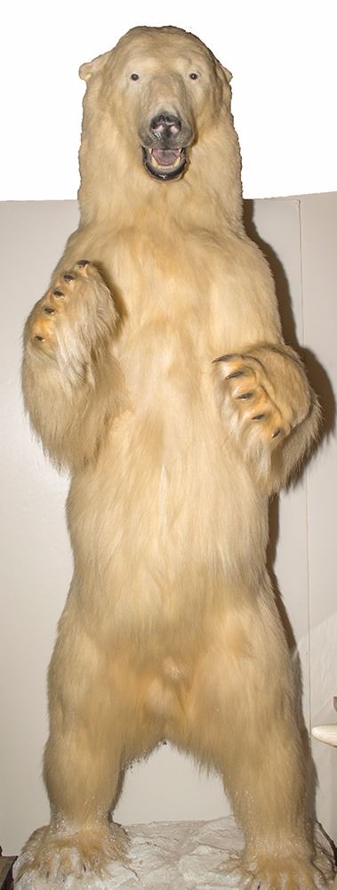 Spectacular Alaskan polar bear full body mount. 10 foot, standing on hind legs, open mouth, arms out. "Ice" base. Killed prior to 1988, on display in a western museum since that time. This animal falls under the terms and conditions of the Marine Mammal Protection Act. It can only be sold in Nevada to a bonafide Nevada resident. Due to the size and weight of this item, local pick-up only. State: City: Date: FHWAC#: 43720
