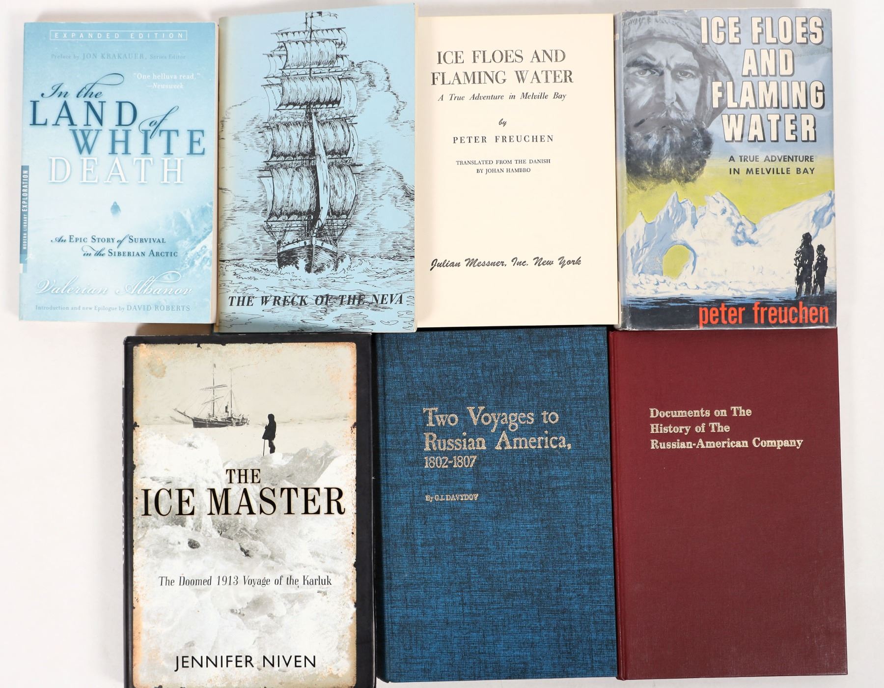A group of 7 books about voyages to and around Alaska, published from 1954 to 2001. Titles included in the lot are 'In The Land of White Death' by V. Athenov; 'The Wreck of the Neva' by V.N. Burke; 'Docs. on the History of the Russian-American Company' by R.A. Pierce; 'Two Voyages to Russian America' by G.I. Davydov; 'The Ice Master' by J. Niven; and 'Ice Floes and Flaming Water' by Peter Freuchen (2 copies). All in good condition besides wear to edges of the cover on some books.