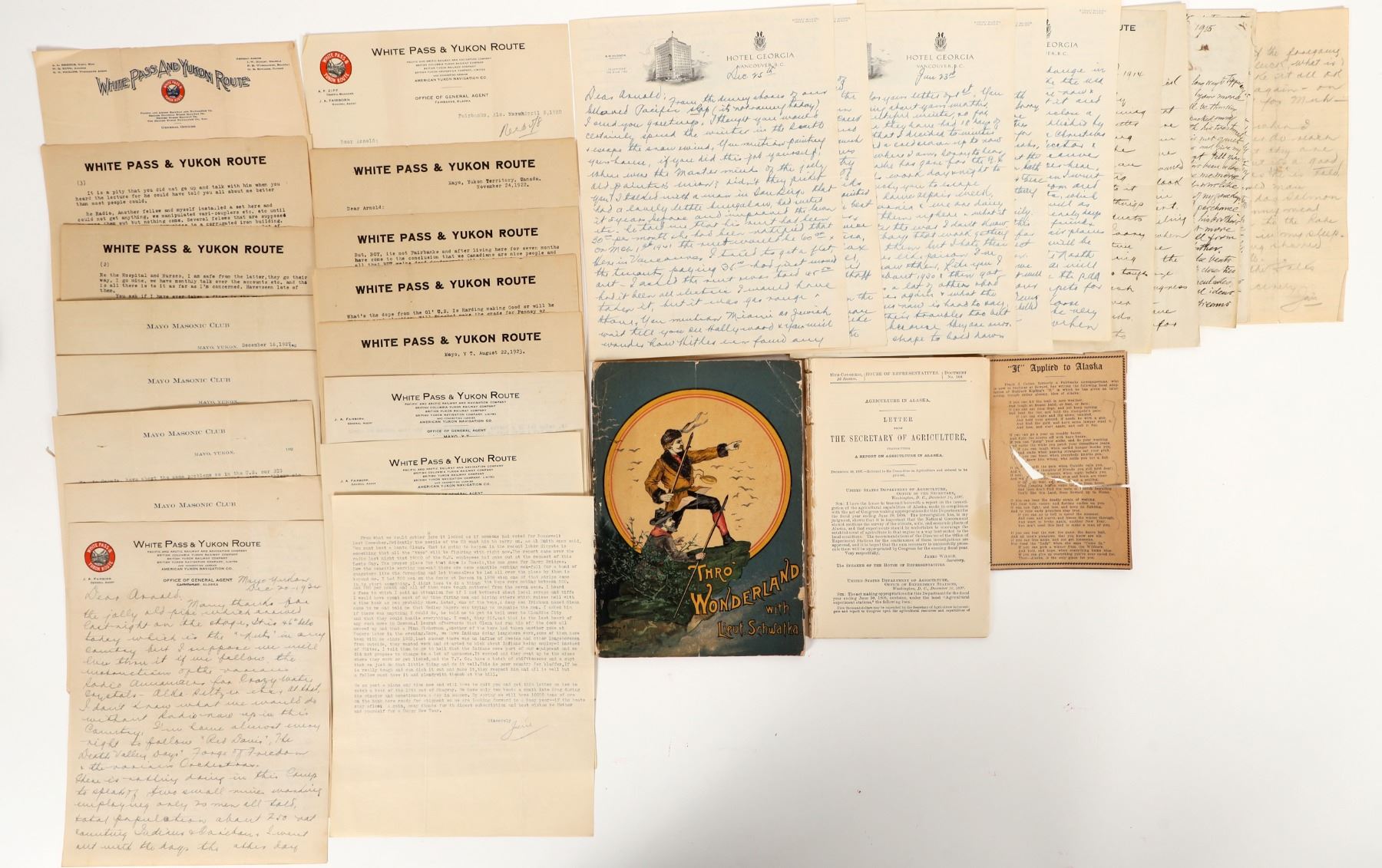 About 30-50 pages of correspondence from a miner working in Alaskan mines, likely written to his brother, Arnold. About half the pages are typed, and the other half are written in cursive, with some pages filled front and back. The highs and lows of each work season are shared, as well as his dirty secrets to making money, like working the mines after hours and pocketing what he mines. The health of the miner, his brother, his sister-in-law, and their mother are discussed in passing. Truly a riveting and personal account of the isolation, harsh winters, risks, and wins from working the Alaskan Yukon. Also included are a copy of "Through Wonderland with Lieut. Schwatka" (exploration of beauty and economic potential of Alaska), missing the back cover and half of the spine, & an agricultural report about Canada, missing both covers. Ephemera in generally good condition. See photo. Measure between 5.75x9" and 8.5x11".