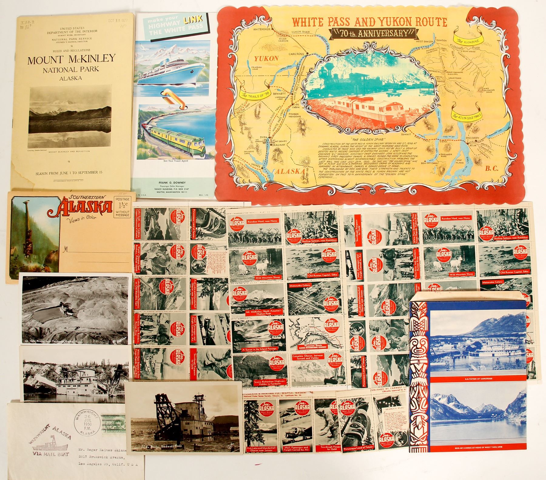 45 Alaskan stamps, and post card. 3 postcards showing gold dredging near Fairbanks, Packet of color pictures of southeastern Alaska. Envelop send from Wainwright, AL via mail boat to LA. Place mat celebrating 70th anniversary of White Pass and Yukon Route with map. Booklet about Mt. KcKinley National Park's rules and regulations. Train Trip Guide Booklet of White Pass & Yukon - Alaska & Yukon.