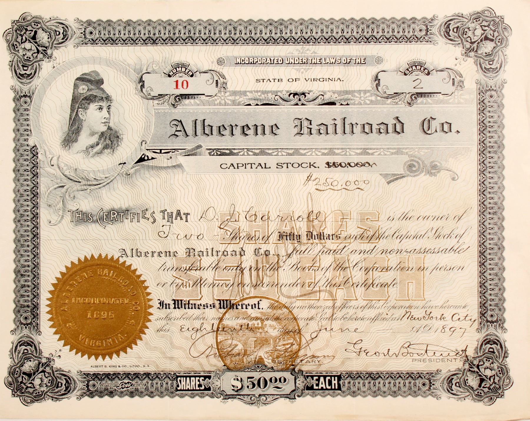 Cancelled two Capital Stock shares of Alberene Railroad Company for D. J Garroll number 10 dated, June 18, 1897. Unlisted railroad in Cox. Ken . Ken Prag Collection