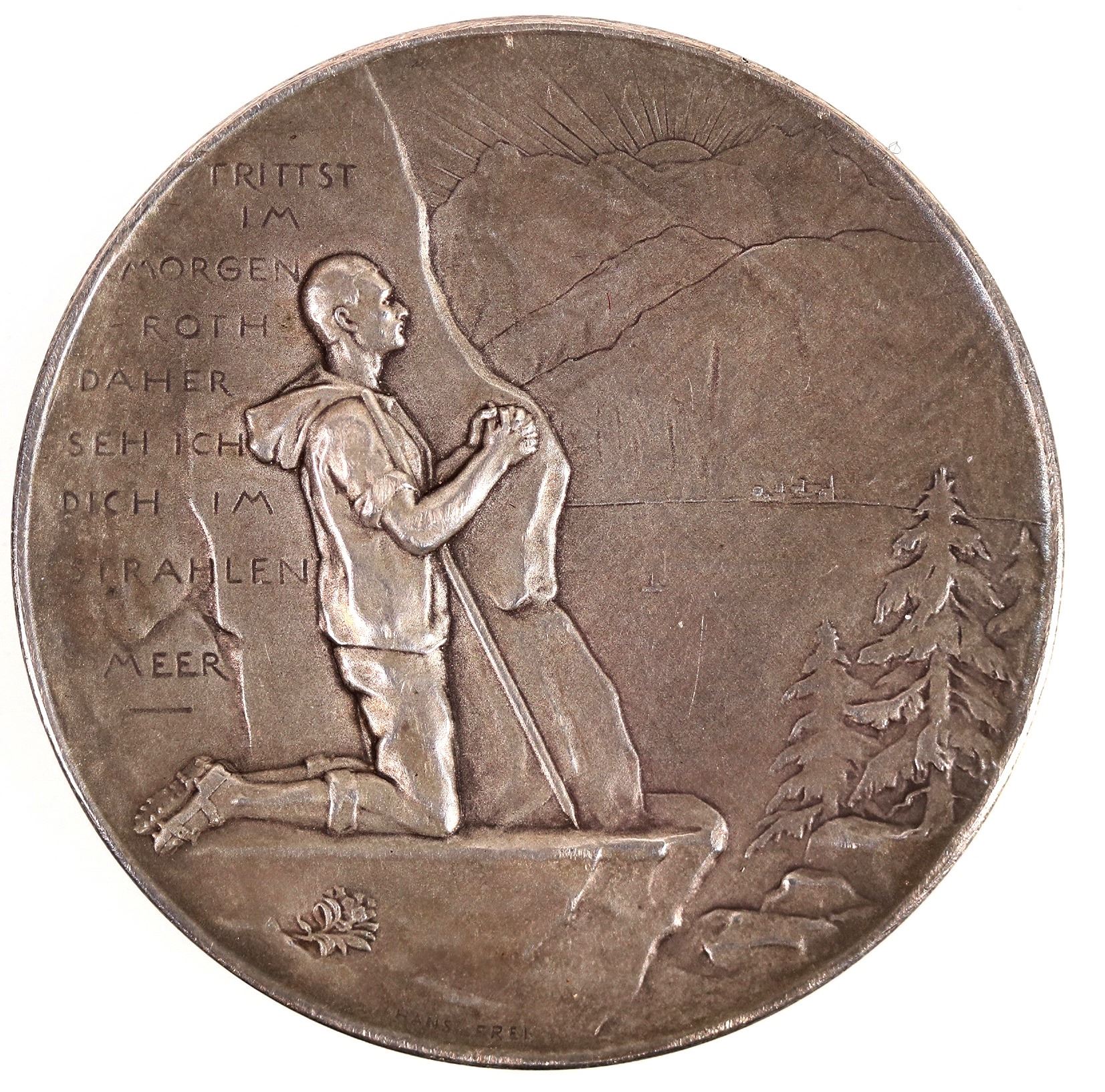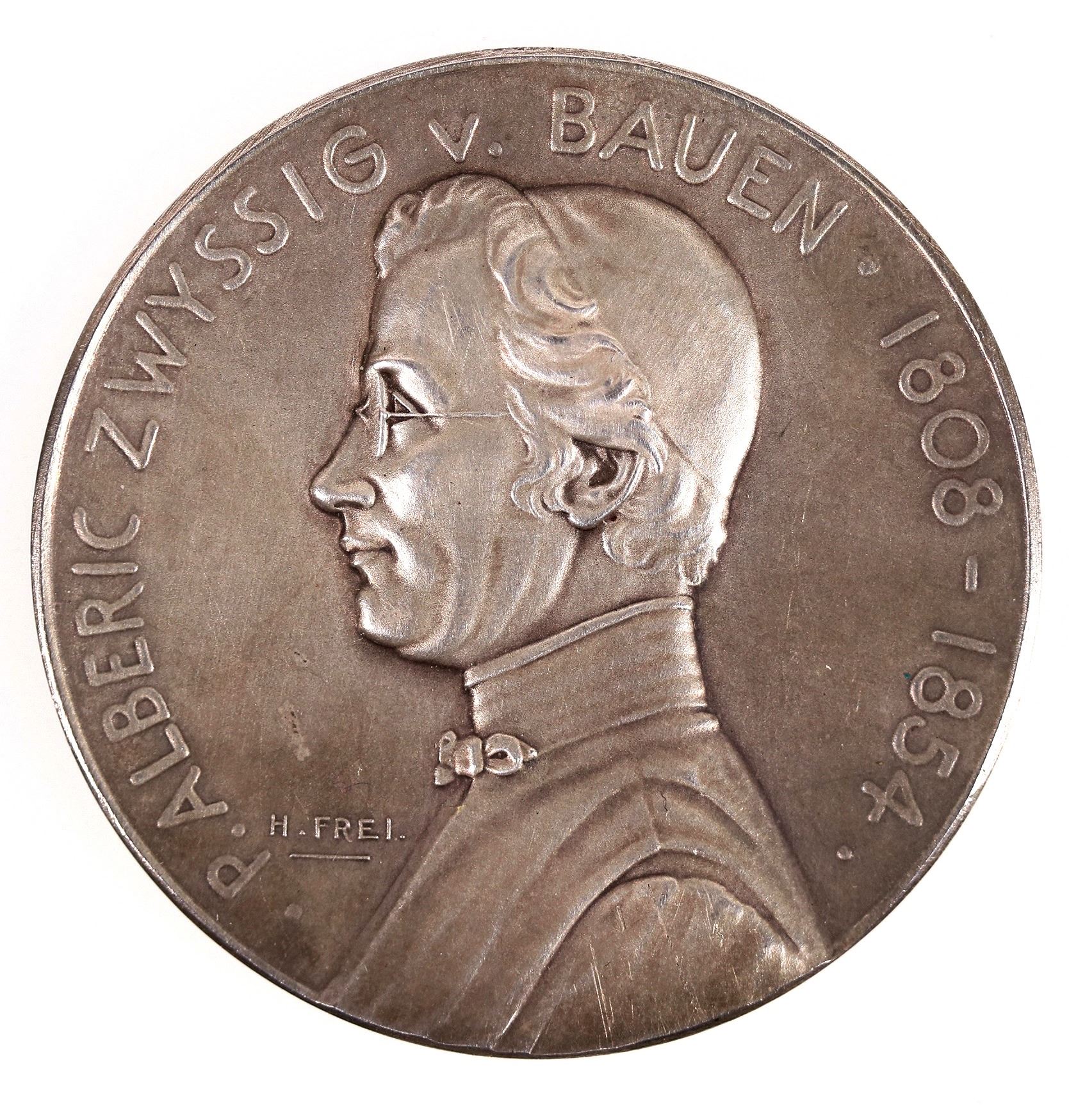 P. Alberich Zwyssig (1808-1854) was a monk who composed the Swiss national anthem. Rare silver medal in hard shell case with purple lining. His portrait on obverse; reverse has him praying on his knees in a mountain scene. 45 mm; 40 grams.