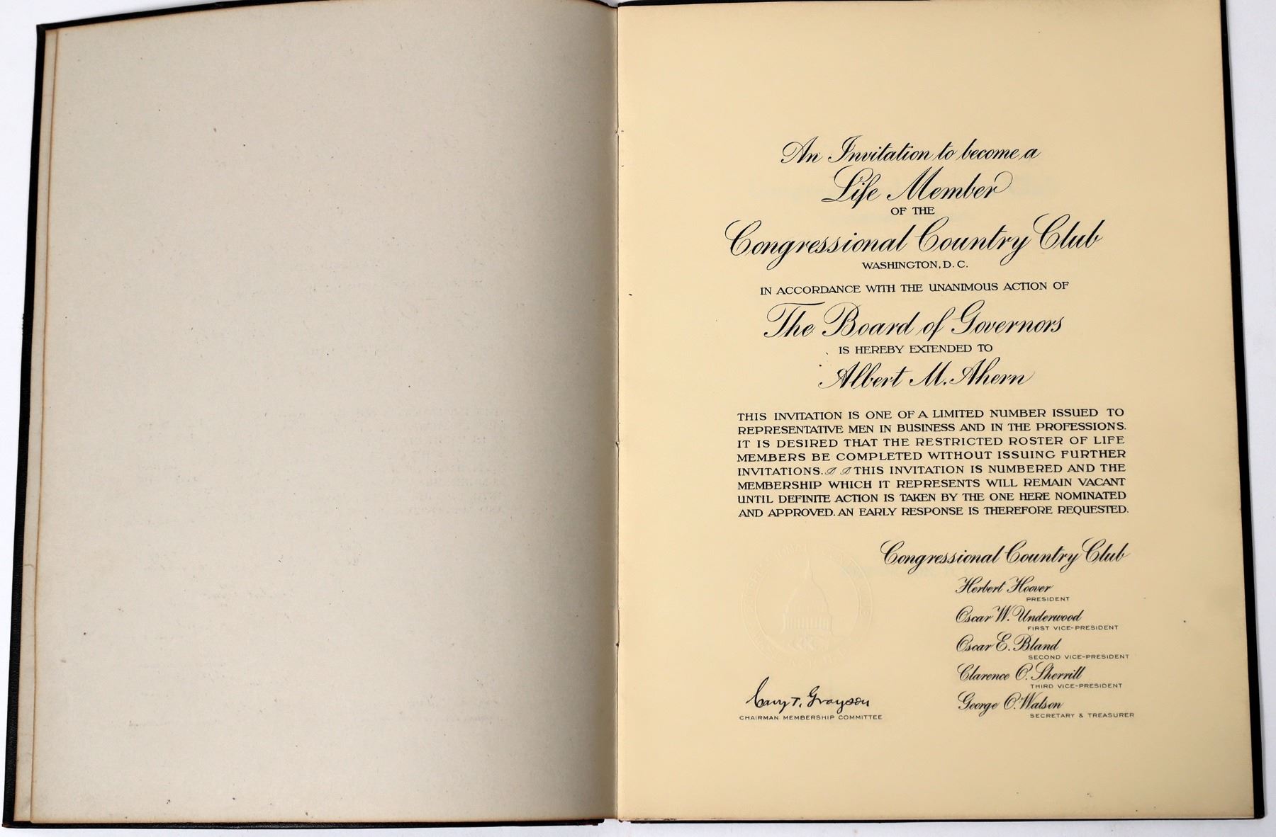 Congressional Country Club invitation for Albert H Ahern, during Herbert Hoover presidential era. About 15 pages with country club illustrations.