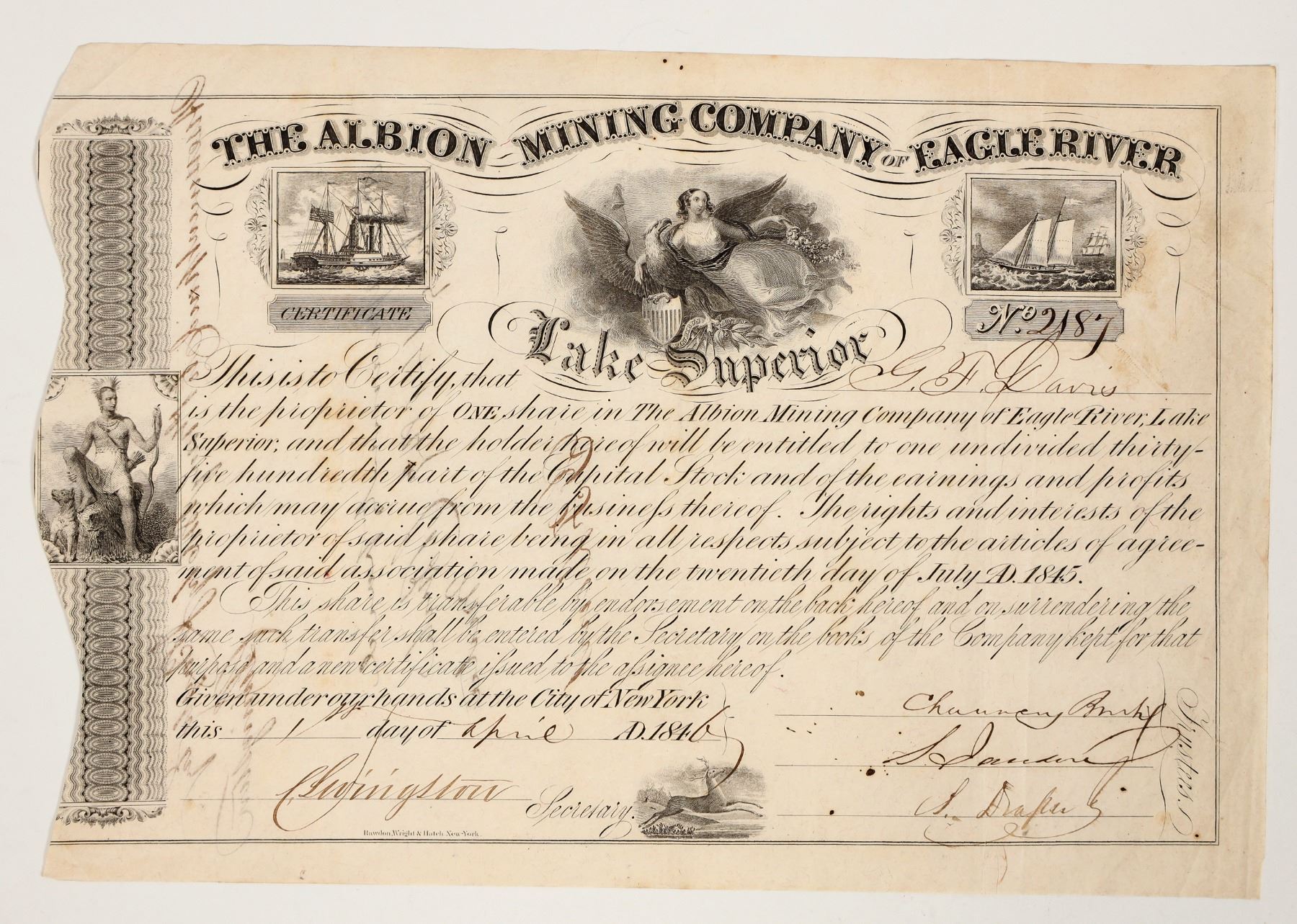 No. 2187, issued for one share to GF Davis in 1846. Signed by the secretary and three trustees. Not cancelled. Two ship vignettes and two allegorical. 6.75 x 10" Wavy cut left border. DeGood pg. 22, R-7 (2 known). Owned 320 acres near Eagle River. Abandoned in 1852.