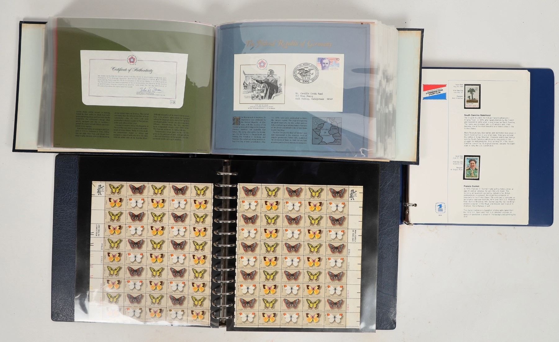 Lot of 3. Three albums in very good condition. 1. US Postal Commemorative Stamps, 29 pages. First Day Issue i.e.; States, Classic Cars. US House of Rep. and Senate. Prehistoric Animals. 2. 22 pgs. only nine have stamps. Birds, Olympics, butterflies and more.