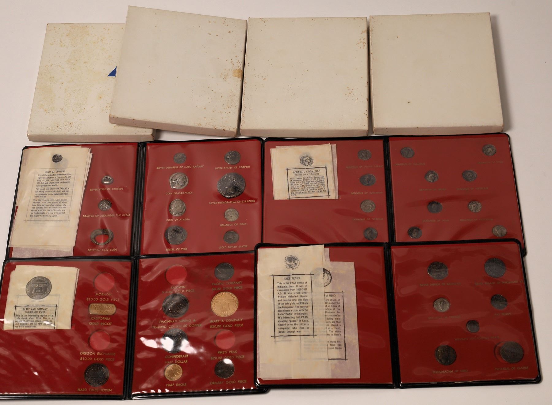 Lot of eight albums, brown plastic covers, (6 x 7 inches). Unknown manufacturer, but each album has printed essays about the history of each coin. A complete numismatic education! 1) Americana Coins (brasher doubloon, Sommer Island Shilling, Continental Dollar, etc.) ; 2) Ancient Coins B.C. (Coin of Athena, Shekel of Tyre, etc.); 3) Biblical Coins (Herod the Great, Stater of Antioch, Shekels, etc.); 4) Ancient Chinese Coins (Knife money, money tree, cash, etc.); 5) The Twelve Caesars (Denarius of Titus, Vitellius, Domitian and the others); 6) Ancient Coins A.D. (Tetradrachm of Nero, Two-real of Castile, Widow's Mite Pontius Pilate, etc.) 7) Western Coins (Blake & Co. $20 gold piece, California gold ingot--some coins missing from this album); 8) Ancient Mythology Coins (Capricorn the Goat, Libra the Balance, Aquarius the water carrier, Pisces the fishes, etc.)