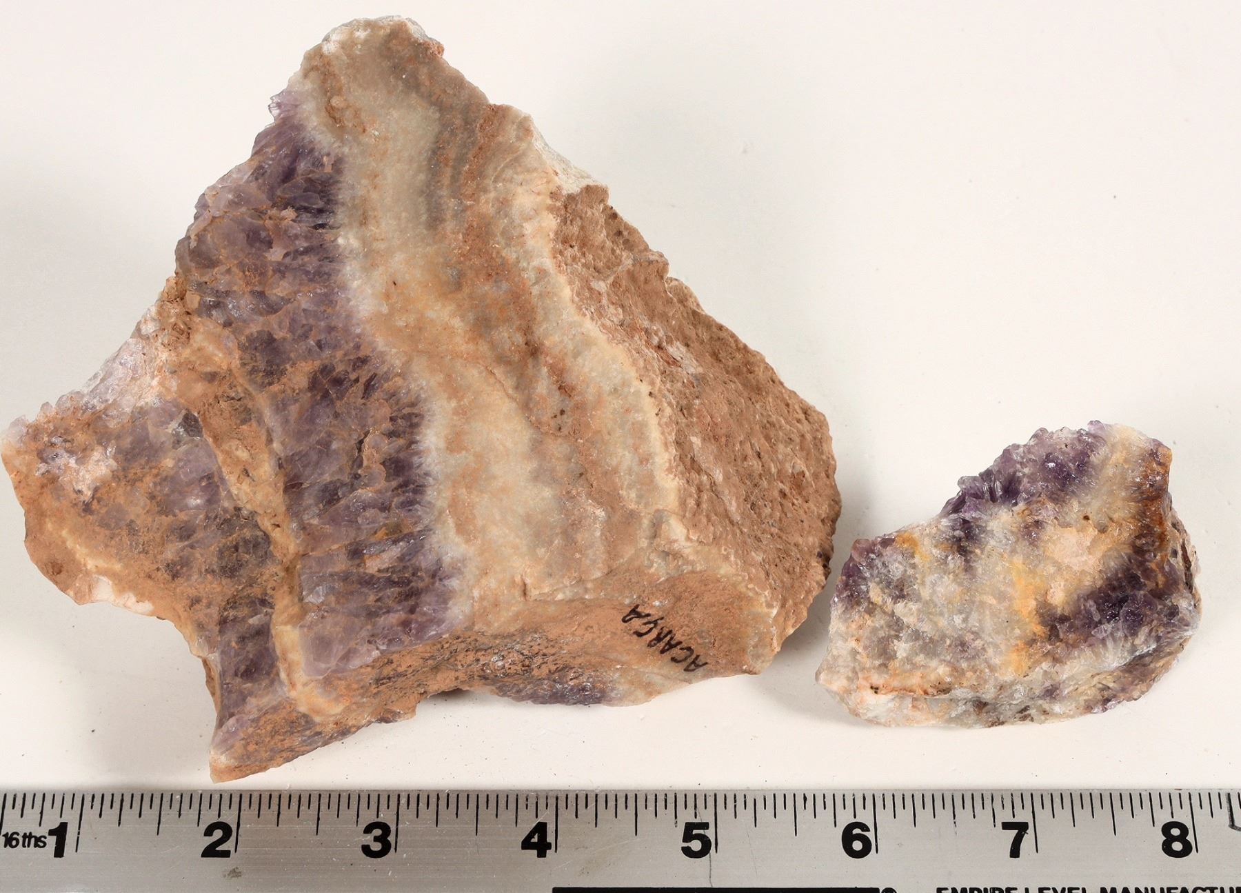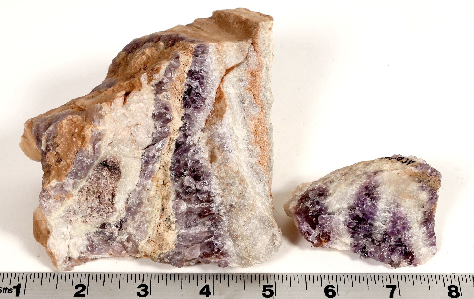 Lot of 2. The two specimens are notable because of banded quartz with amethyst. 4 x 4 x3" and 2.5. x 1.5 x 2" Alcarca Brazil is a notable rare earths mine. It's the Hot Topic today in mining.
