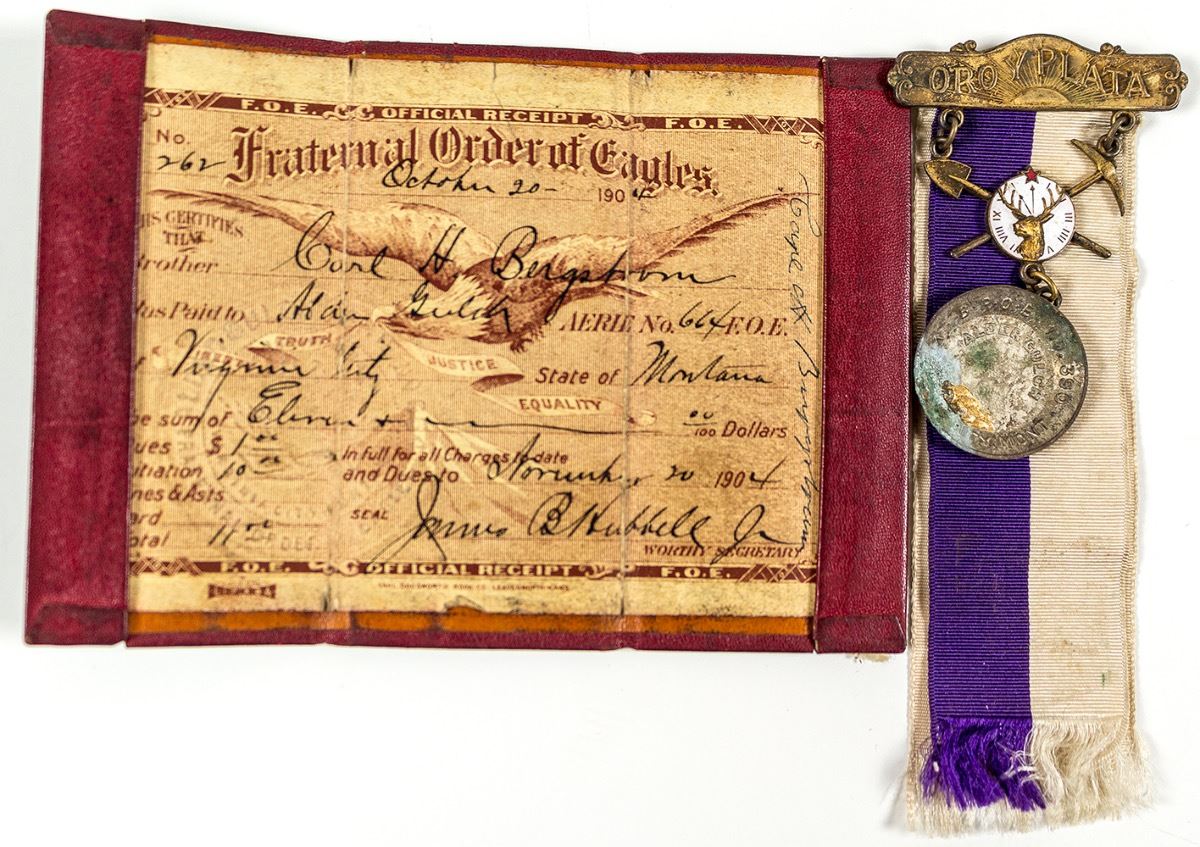Included are an Identity card for the Alder gulch Aerie No. 664, Fraternal Order of Eagles in a leather case--Carl H. Bergstrom, 1904; and a medal and ribbon: Oro Y Plata, miners shovel and pick, with a gold pan attached. City: Virginia City State: Montana, Date: Inventory# 40626