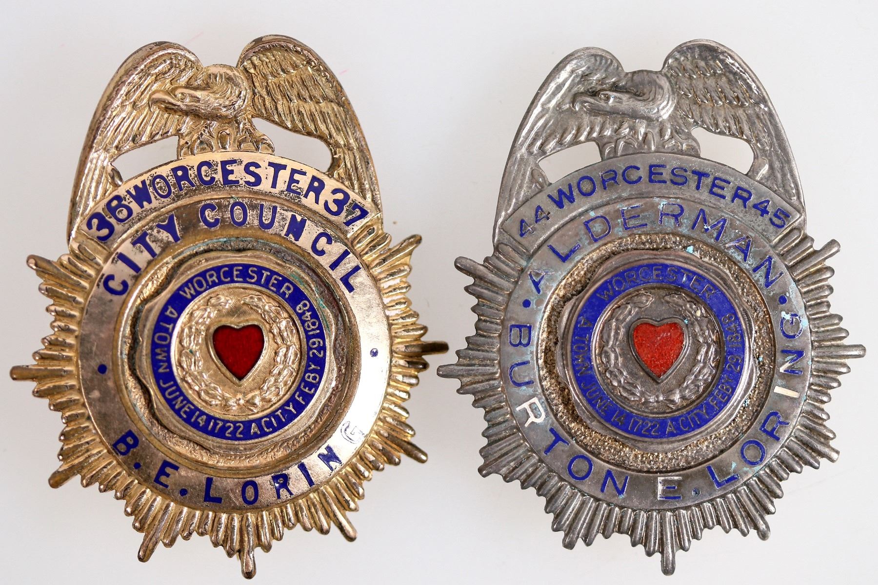 Berton Loring served as city councilman and alderman in Worcester. Two badges: City council Worcester 1936-37; 47 x 51 mm. Alderman 1944-45; 42 x52 mm.
