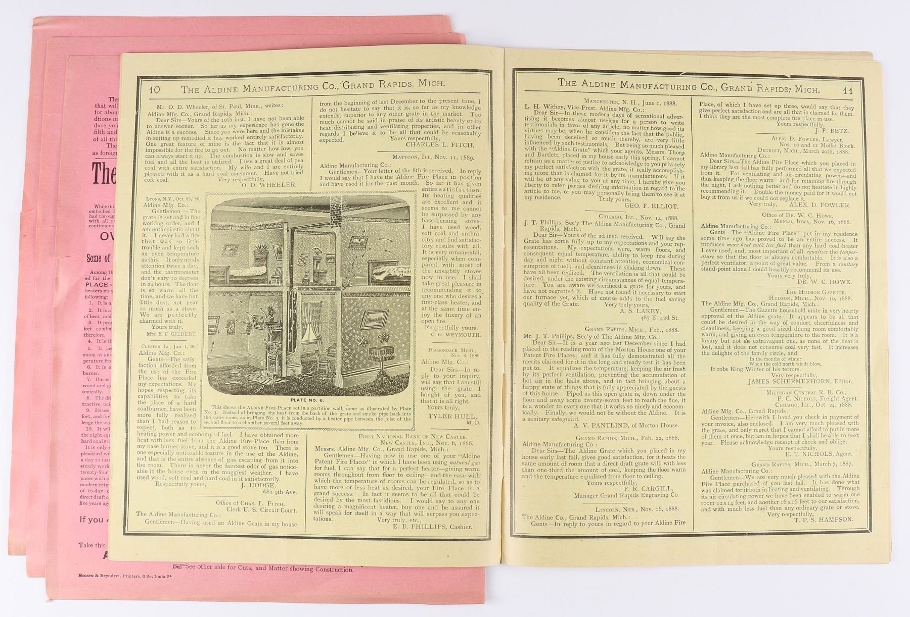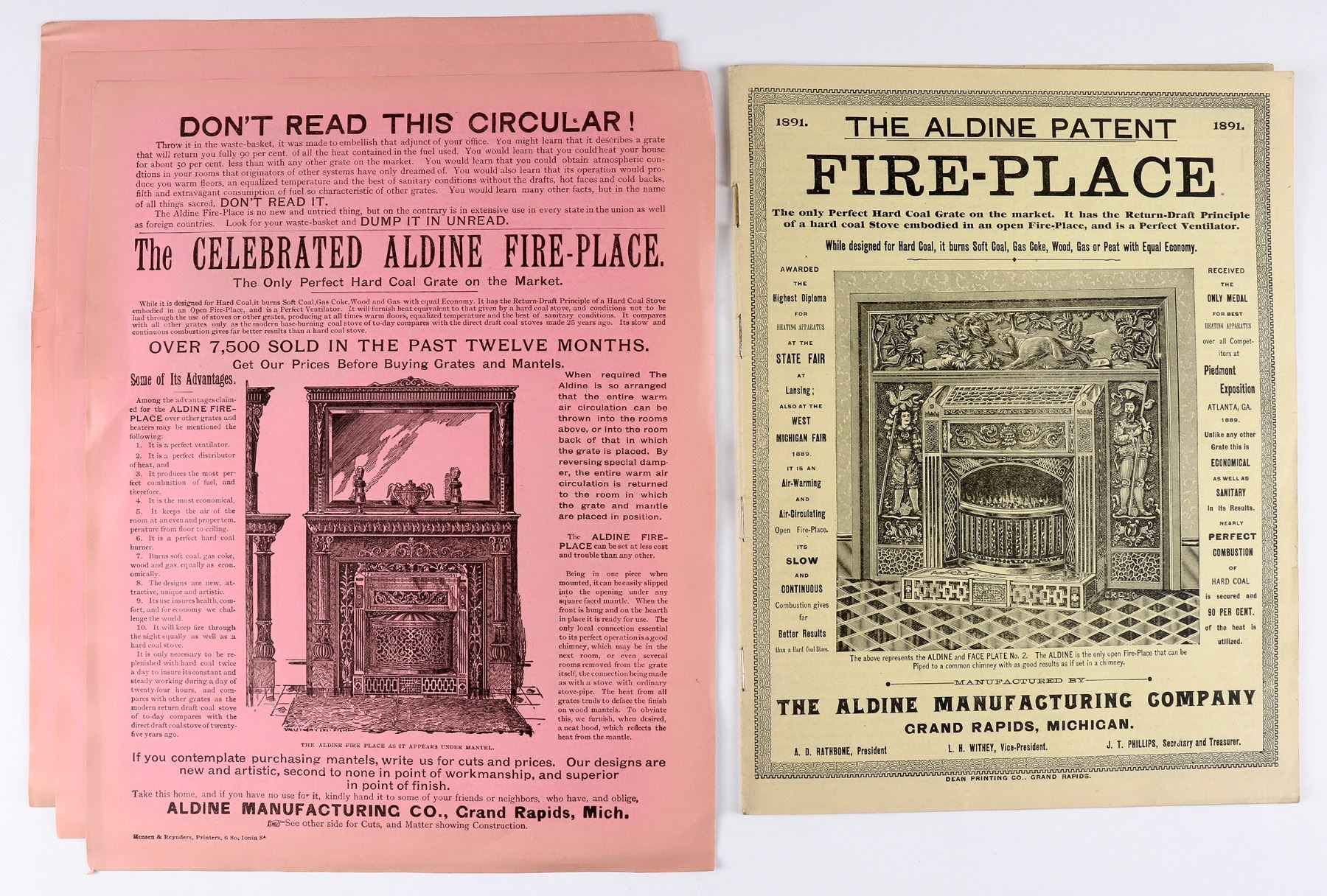 Aldine Fireplace, Grand Rapids, MI ephemera. 4x rose pictorial circular 12.5x10". 1891 30pp illustrated catalog with testimonials.