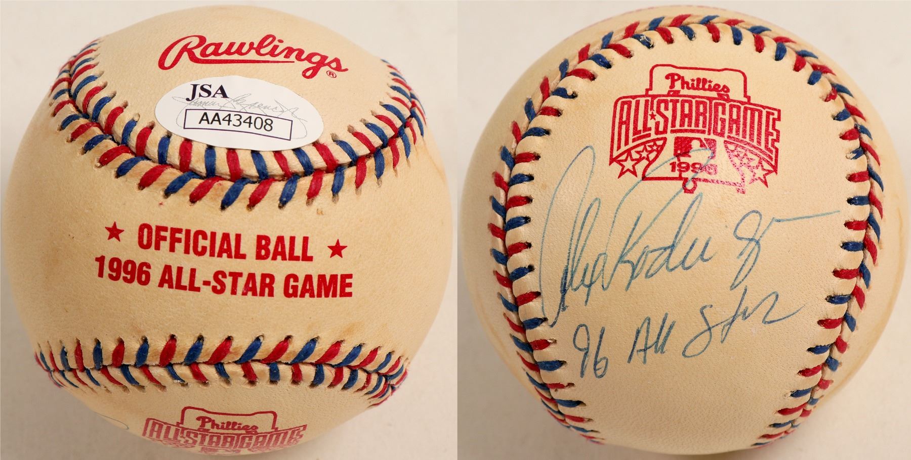 This is an autographed baseball signed by A. Rod. as an official ball of the 1996 All-Star game. JSA #AA43408. The ball is unique with red and blue lacings. It comes in a UV clear plastic case.
