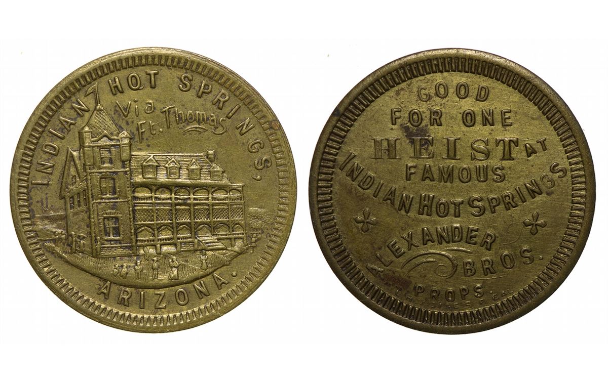 The only token from Indian Hot Springs: Obv.: Indian Hot Springs / via / Ft. Thomas / hotel pictorial / Arizona; Rev.: Good / For one / Heist at / Famous / Indian Hot Springs/ Alexander / Bros. / Props; 31mm, R8.