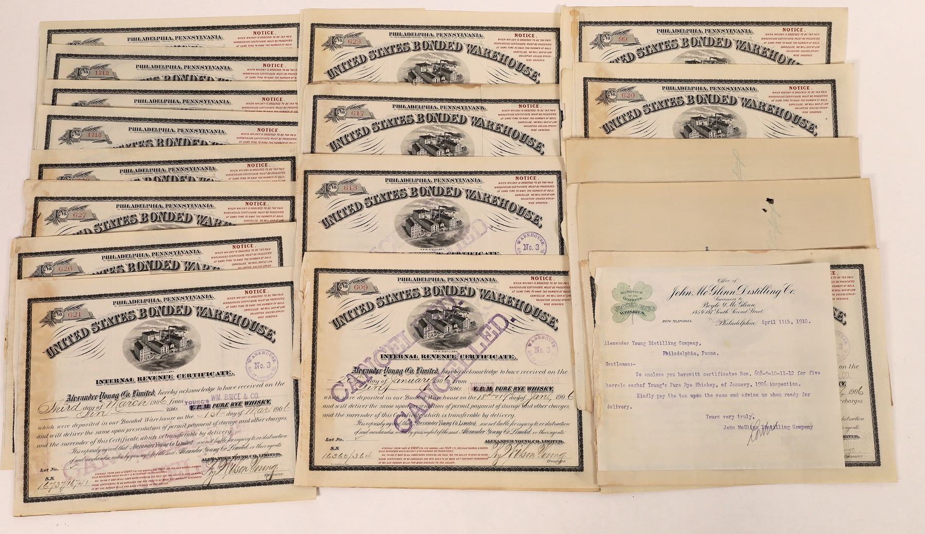 Lot of 20+. These are United States Bonded Warehouse, Internal Revenue Certificates. Includes about 16 issued, 1896-1911, many with other receipts/invoices attached, plus 4 unissued. Feature a labelled vignette of the YPM Distillery. Printed by George H. Buchanan Co., Philadelphia. Alexander Young and John Maitland went into the distilling business together in the 1820s. When Young died in 1884, his sons took over the distillery In 1887, they formed a corporation to run the plant. In the 1950's, the company's flagship brand, Young's Special American Blended Whiskey, was purchased by Kasser Distillers Products Corp.