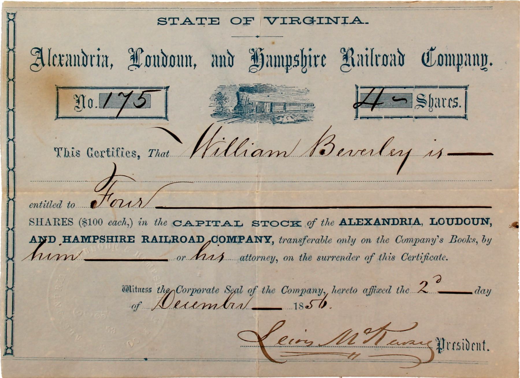 Four shares of Alexandria, Londonn, and Hampshire Railroad Company stock. Owner Willliam Beverley signed on December 2, 1856. no 175. The Alexandria, Loudonn & Hampshire was built to compete with the Baltimore & Ohio Railroad. It transported products coming from the north part of Virginia bringing them to Alexandria, Virginia. Started in 1847 but not completed until 1855.Unlisted in Cox. Ken Prag Collection.