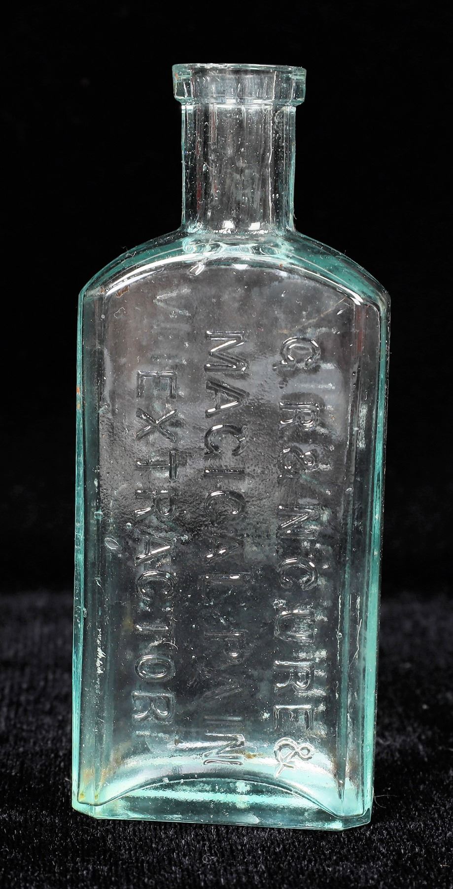 We could not find any info on this druggist. Light aqua Alfred Nesmith/address removed/Philadelphia//C. R. & N. Cure &/Magical Pain/Extractor. Small lip ding, no apparent chips or cracks. 5". Pennsylvania Philadelphia Philadelphia Pennsylvania