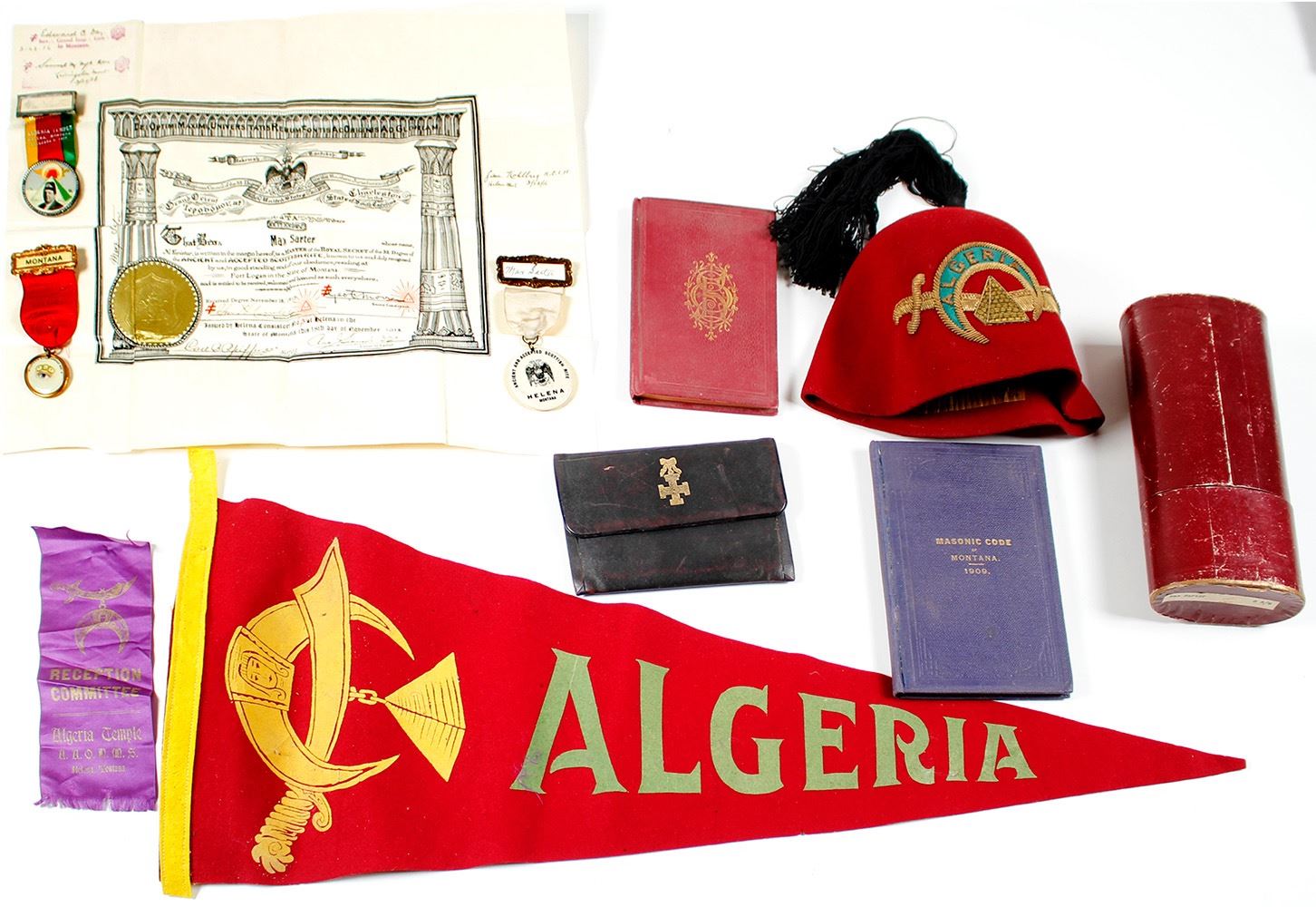 Memorabilia from an Algeria Shriner, Max Sarter. Included: hat in leather case, 3 pins, certificate, pennant, Masonic Code Book of Montana, 1909, Ritual of the Order Eastern Star, small leather pocket pouch. Algeria Shriners International is the home of the Algeria Shrine Temple in Helena, MT. Date: early 1900's Location: Helena, Montana HWAC# 40619