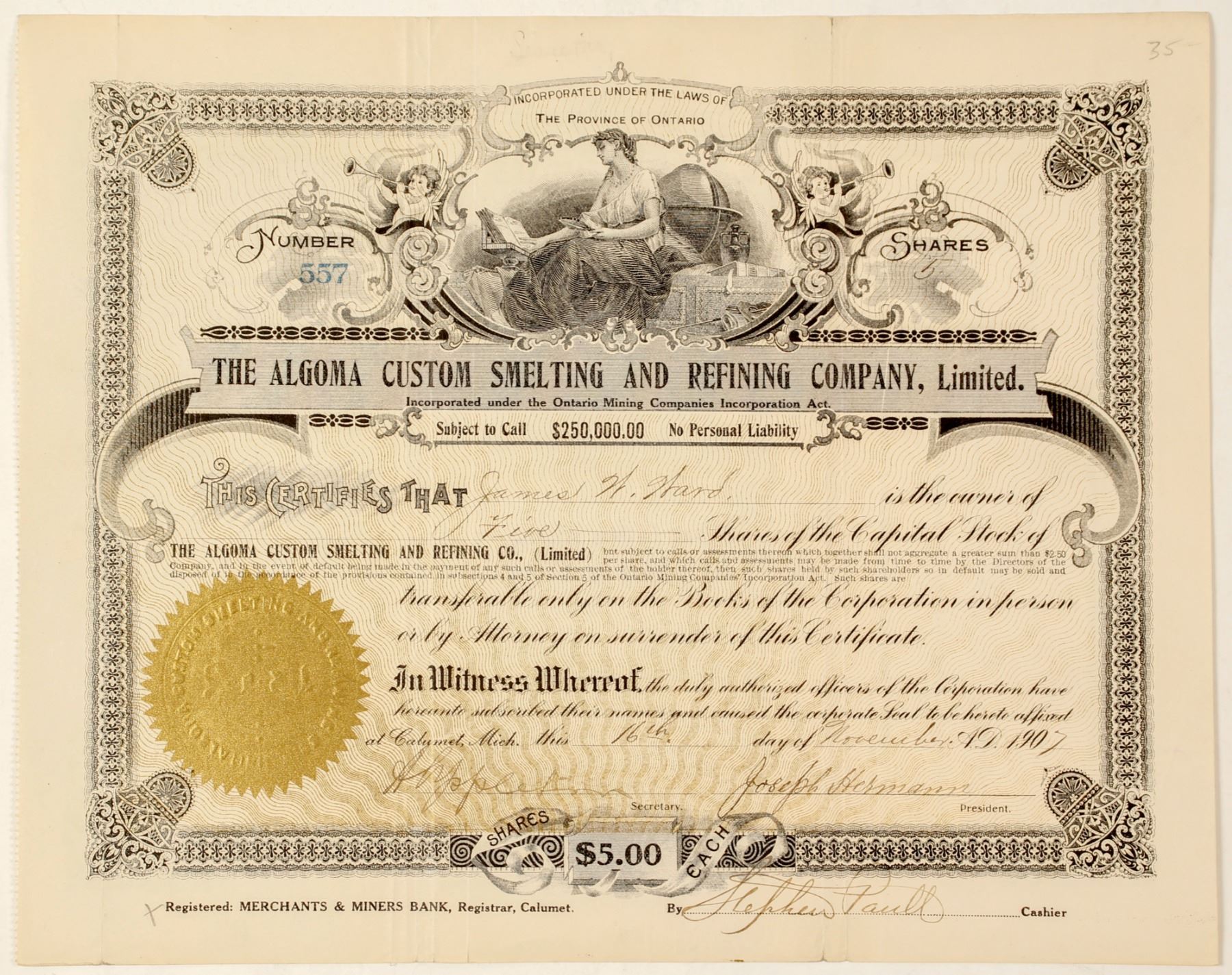 Registered in Calumet, Michigan. Inc. in Ontario. No. 557, issued for 5 shares to James W. Ward on November 16th. 1907. Signed by president Joseph Hermann and the secretary. Not cancelled. Ornate border and allegorical vignette. Pinholes, folds with tape repairs. 8.5 x 10.5" According to the 1908 Report of the Ontario Department of Mines, the company's main interest was the Hermina Mining Company. They had erected a copper smelter at Thessalon. They were considering ore contracts from mines such as the Superior Mine. (Prag Collection) State: Canada City: Ontario Date: 1907