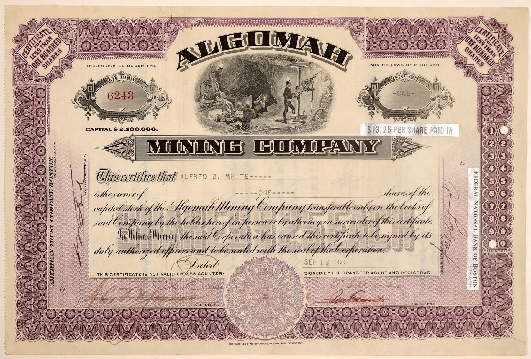 Inc. in Michigan. No. 6243, issued for one share to Alfred B. White on Sep. 12, 1924. Two sets of corporate signatures (first ones crossed out). Purple border, black print, and underground mining vignette featuring drills. Printed by ABN, Boston. Heavy folds. 7.75 x 11.25" An underground copper mine consisting of one shaft located near Mass City, about 16 miles SE of Ontonagon, MI. The "old" Algomah Mining Co. was organized in 1852 and worked the mine until 1854, when the mine was deemed a failure and closed. The "new" Algomah Mining Co. was organized in 1910. No rock was ever milled onsite, but in 1914, 12,467 lbs. of refined copper was recovered from hand-picked ore. [Ref: mindat.org] Houghton Estate Collection