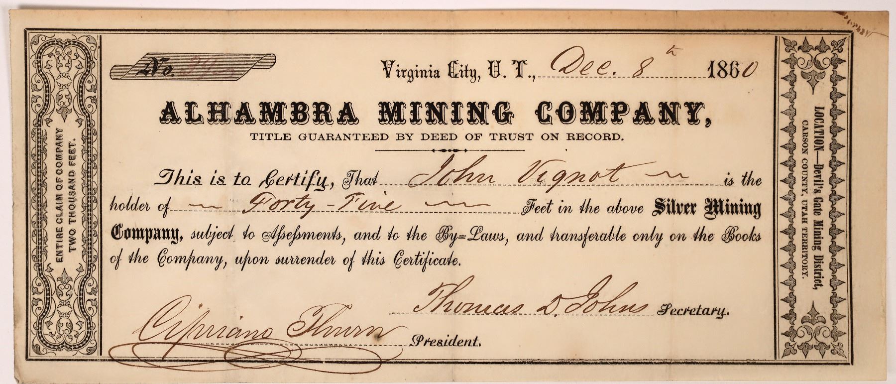 Alhambra Mining Company Stock - Datelined Dec. 8th, 1860, Virginia City, Utah Territory - Perhaps the oldest Comstock Mining certificate known! Certificate # 39 for 45 shares to John Vignot. Datelined Virginia City, U.T. 1860. Signed by Secretary, Thomas D. Johns and president, Cipriano Thurn(?) Entire claim of company is 2,000 feet. Location at Devil's Gate Mining District, Carson County, Utah Territory. Plenty of articles appear in the California papers on assessments (through 1864), but no articles appear on the progress of the mine. This seems to be more of a money pit than a money maker! A search of Carson County Records [The Records of Carson County, Utah & Nevada Territories by Ellison] show us that John Vignot was an early prospector in this area. On May 11, 1861, he, Patrick McClaughlin (credited with being one of the men to find the Comstock Lode) and others applied for water rights at Gold Hill. On July 8, 1861, Vignot with others bought 500 feet of a recently discovered lode from McLaughlin, Peter O'Reilly (the other discoverer of the Comstock lode), et al.