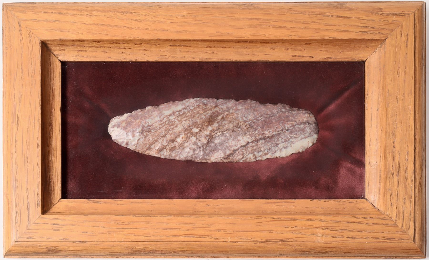 This beautiful rainbow hue Alibates flint knife was found on the Arkansas River in Kay County, Oklahoma. Alibate flint has been quarried in the Texas Panhandle for thousands of years and this one was found about 200 miles from its source. It is 5.75 in./ 146 mm in length, percussion shaped and pressure knapped for sharpness. A beautiful find and displayed in red velvet and oak framed. From the Gary Bracken collection. Please see photos for details.